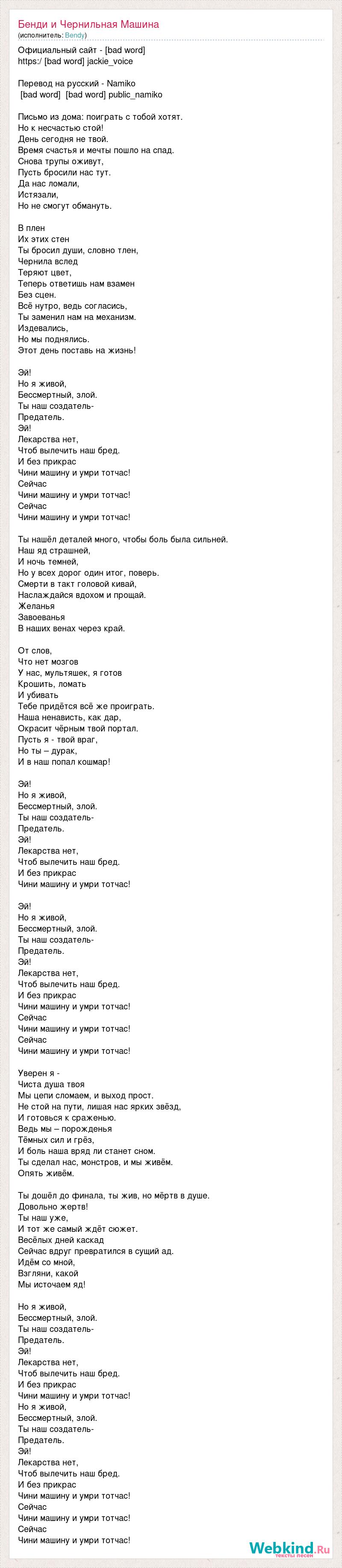 Официальный сайт - [bad word] https:/ [bad word] jackie_voice Перевод на русский - Namiko [bad word] [bad word] public_namiko Письмо из дома: поиграть с тобой хотят. Но к несчастью стой! День сегодня не твой. Время счастья и мечты пошло на спад. Снова трупы оживут, Пусть бросили нас тут. Да нас ломали, Истязали, Но не смогут обмануть. В плен Их этих стен Ты бросил души, словно тлен, Чернила вслед Теряют цвет, Теперь ответишь нам взамен Без сцен. Всё нутро, ведь согласись, Ты заменил нам на механизм. Издевались, Но мы поднялись. Этот день поставь на жизнь! Эй! Но я живой, Бессмертный, злой. Ты наш создатель- Предатель. Эй! Лекарства нет, Чтоб вылечить наш бред. И без прикрас Чини машину и умри тотчас! Сейчас Чини машину и умри тотчас! Сейчас Чини машину и умри тотчас! Ты нашёл деталей много, чтобы боль была сильней. Наш яд страшней, И ночь темней, Но у всех дорог один итог, поверь. Смерти в такт головой кивай, Наслаждайся вдохом и прощай. Желанья Завоеванья В наших венах через край. От слов, Что нет мозгов У нас, мультяшек, я готов Крошить, ломать И убивать Тебе придётся всё же проиграть. Наша ненависть, как дар, Окрасит чёрным твой портал. Пусть я - твой враг, Но ты – дурак, И в наш попал кошмар! Эй! Но я живой, Бессмертный, злой. Ты наш создатель- Предатель. Эй! Лекарства нет, Чтоб вылечить наш бред. И без прикрас Чини машину и умри тотчас! Эй! Но я живой, Бессмертный, злой. Ты наш создатель- Предатель. Эй! Лекарства нет, Чтоб вылечить наш бред. И без прикрас Чини машину и умри тотчас! Сейчас Чини машину и умри тотчас! Сейчас Чини машину и умри тотчас! Уверен я - Чиста душа твоя Мы цепи сломаем, и выход прост. Не стой на пути, лишая нас ярких звёзд, И готовься к сраженью. Ведь мы – порожденья Тёмных сил и грёз, И боль наша вряд ли станет сном. Ты сделал нас, монстров, и мы живём. Опять живём. Ты дошёл до финала, ты жив, но мёртв в душе. Довольно жертв! Ты наш уже, И тот же самый ждёт сюжет. Весёлых дней каскад Сейчас вдруг превратился в сущий ад. Идём со мной, Взгляни, какой Мы источаем яд! Но я живой, Бессмертный, злой. Ты наш создатель- Предатель. Эй! Лекарства нет, Чтоб вылечить наш бред. И без прикрас Чини машину и умри тотчас! Но я живой, Бессмертный, злой. Ты наш создатель- Предатель. Эй! Лекарства нет, Чтоб вылечить наш бред. И без прикрас Чини машину и умри тотчас! Сейчас Чини машину и умри тотчас! Сейчас Чини машину и умри тотчас!