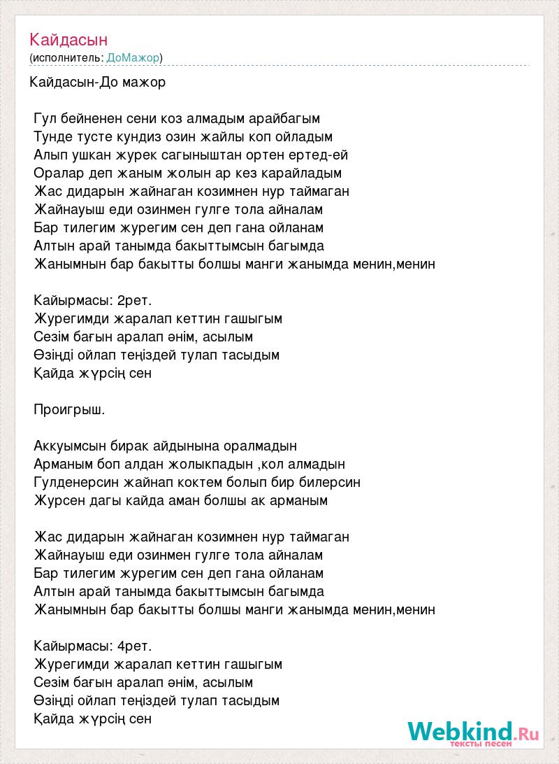 Кайдасын-До мажор Гул бейненен сени коз алмадым арайбагым Тунде тусте кундиз озин жайлы коп ойладым Алып ушкан журек сагыныштан ортен ертед-ей Оралар деп жаным жолын ар кез карайладым Жас дидарын жайнаган козимнен нур таймаган Жайнауыш еди озинмен гулге тола айналам Бар тилегим журегим сен деп гана ойланам Алтын арай танымда бакыттымсын багымда Жанымнын бар бакытты болшы манги жанымда менин,менин Кайырмасы: 2рет. Журегимди жаралап кеттин гашыгым Сезім бағын аралап әнім, асылым Өзіңді ойлап теңіздей тулап тасыдым Қайда жүрсің сен Проигрыш. Аккуымсын бирак айдынына оралмадын Арманым боп алдан жолыкпадын ,кол алмадын Гулденерсин жайнап коктем болып бир билерсин Журсен дагы кайда аман болшы ак арманым Жас дидарын жайнаган козимнен нур таймаган Жайнауыш еди озинмен гулге тола айналам Бар тилегим журегим сен деп гана ойланам Алтын арай танымда бакыттымсын багымда Жанымнын бар бакытты болшы манги жанымда менин,менин Кайырмасы: 4рет. Журегимди жаралап кеттин гашыгым Сезім бағын аралап әнім, асылым Өзіңді ойлап теңіздей тулап тасыдым Қайда жүрсің сен