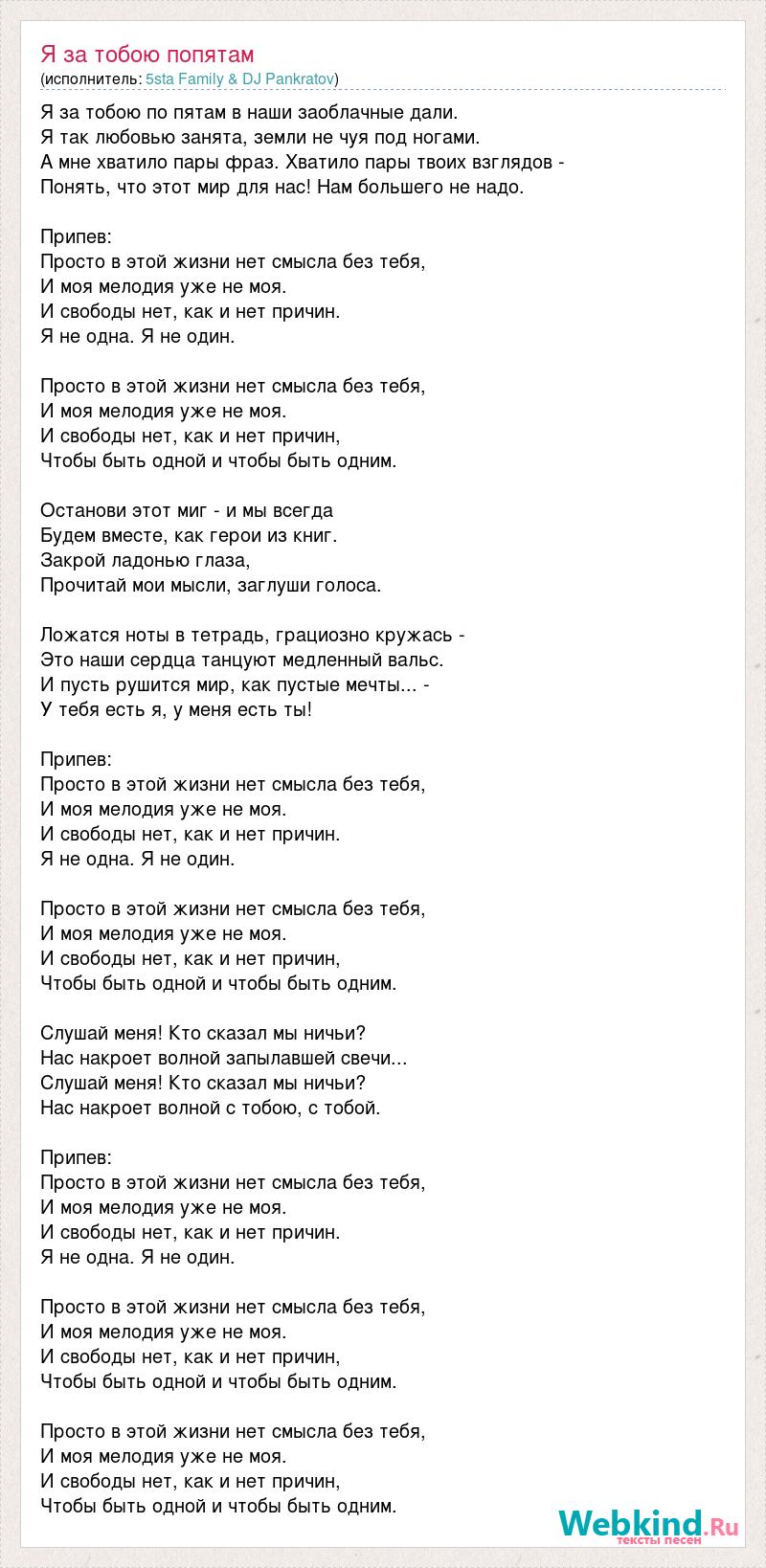 Я за тобою по пятам в наши заоблачные дали. Я так любовью занята, земли не чуя под ногами. А мне хватило пары фраз. Хватило пары твоих взглядов - Понять, что этот мир для нас! Нам большего не надо. Припев: Просто в этой жизни нет смысла без тебя, И моя мелодия уже не моя. И свободы нет, как и нет причин. Я не одна. Я не один. Просто в этой жизни нет смысла без тебя, И моя мелодия уже не моя. И свободы нет, как и нет причин, Чтобы быть одной и чтобы быть одним. Останови этот миг - и мы всегда Будем вместе, как герои из книг. Закрой ладонью глаза, Прочитай мои мысли, заглуши голоса. Ложатся ноты в тетрадь, грациозно кружась - Это наши сердца танцуют медленный вальс. И пусть рушится мир, как пустые мечты... - У тебя есть я, у меня есть ты! Припев: Просто в этой жизни нет смысла без тебя, И моя мелодия уже не моя. И свободы нет, как и нет причин. Я не одна. Я не один. Просто в этой жизни нет смысла без тебя, И моя мелодия уже не моя. И свободы нет, как и нет причин, Чтобы быть одной и чтобы быть одним. Слушай меня! Кто сказал мы ничьи? Нас накроет волной запылавшей свечи... Слушай меня! Кто сказал мы ничьи? Нас накроет волной с тобою, с тобой. Припев: Просто в этой жизни нет смысла без тебя, И моя мелодия уже не моя. И свободы нет, как и нет причин. Я не одна. Я не один. Просто в этой жизни нет смысла без тебя, И моя мелодия уже не моя. И свободы нет, как и нет причин, Чтобы быть одной и чтобы быть одним. Просто в этой жизни нет смысла без тебя, И моя мелодия уже не моя. И свободы нет, как и нет причин, Чтобы быть одной и чтобы быть одним.