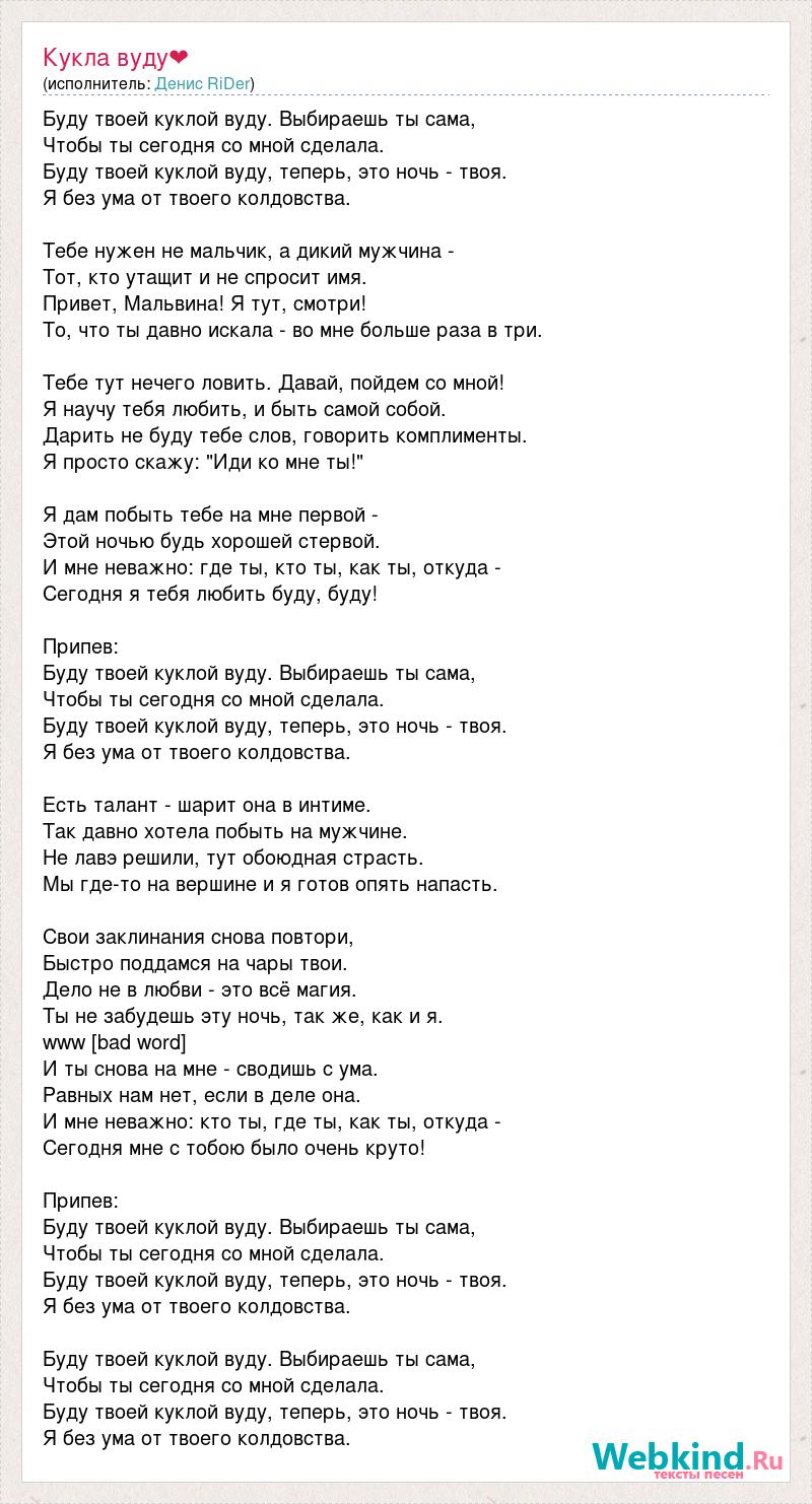 Буду твоей куклой вуду. Выбираешь ты сама, Чтобы ты сегодня со мной сделала. Буду твоей куклой вуду, теперь, это ночь - твоя. Я без ума от твоего колдовства. Тебе нужен не мальчик, а дикий мужчина - Тот, кто утащит и не спросит имя. Привет, Мальвина! Я тут, смотри! То, что ты давно искала - во мне больше раза в три. Тебе тут нечего ловить. Давай, пойдем со мной! Я научу тебя любить, и быть самой собой. Дарить не буду тебе слов, говорить комплименты. Я просто скажу: "Иди ко мне ты!" Я дам побыть тебе на мне первой - Этой ночью будь хорошей стервой. И мне неважно: где ты, кто ты, как ты, откуда - Сегодня я тебя любить буду, буду! Припев: Буду твоей куклой вуду. Выбираешь ты сама, Чтобы ты сегодня со мной сделала. Буду твоей куклой вуду, теперь, это ночь - твоя. Я без ума от твоего колдовства. Есть талант - шарит она в интиме. Так давно хотела побыть на мужчине. Не лавэ решили, тут обоюдная страсть. Мы где-то на вершине и я готов опять напасть. Свои заклинания снова повтори, Быстро поддамся на чары твои. Дело не в любви - это всё магия. Ты не забудешь эту ночь, так же, как и я. www [bad word] И ты снова на мне - сводишь с ума. Равных нам нет, если в деле она. И мне неважно: кто ты, где ты, как ты, откуда - Сегодня мне с тобою было очень круто! Припев: Буду твоей куклой вуду. Выбираешь ты сама, Чтобы ты сегодня со мной сделала. Буду твоей куклой вуду, теперь, это ночь - твоя. Я без ума от твоего колдовства. Буду твоей куклой вуду. Выбираешь ты сама, Чтобы ты сегодня со мной сделала. Буду твоей куклой вуду, теперь, это ночь - твоя. Я без ума от твоего колдовства.