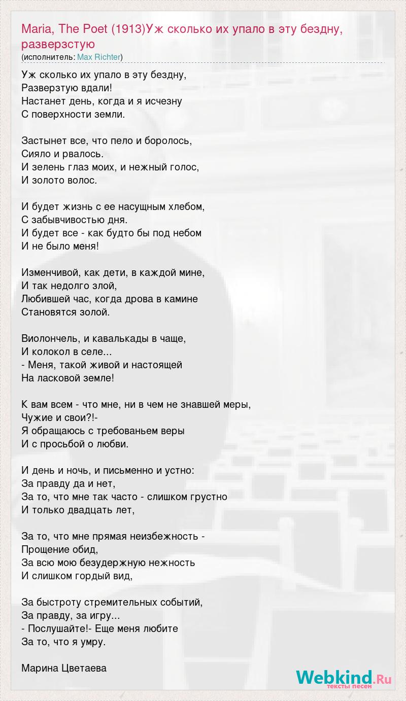 Уж сколько их упало в эту бездну, Разверзтую вдали! Настанет день, когда и я исчезну С поверхности земли. Застынет все, что пело и боролось, Сияло и рвалось. И зелень глаз моих, и нежный голос, И золото волос. И будет жизнь с ее насущным хлебом, С забывчивостью дня. И будет все - как будто бы под небом И не было меня! Изменчивой, как дети, в каждой мине, И так недолго злой, Любившей час, когда дрова в камине Становятся золой. Виолончель, и кавалькады в чаще, И колокол в селе... - Меня, такой живой и настоящей На ласковой земле! К вам всем - что мне, ни в чем не знавшей меры, Чужие и свои?!- Я обращаюсь с требованьем веры И с просьбой о любви. И день и ночь, и письменно и устно: За правду да и нет, За то, что мне так часто - слишком грустно И только двадцать лет, За то, что мне прямая неизбежность - Прощение обид, За всю мою безудержную нежность И слишком гордый вид, За быстроту стремительных событий, За правду, за игру... - Послушайте!- Еще меня любите За то, что я умру. Марина Цветаева