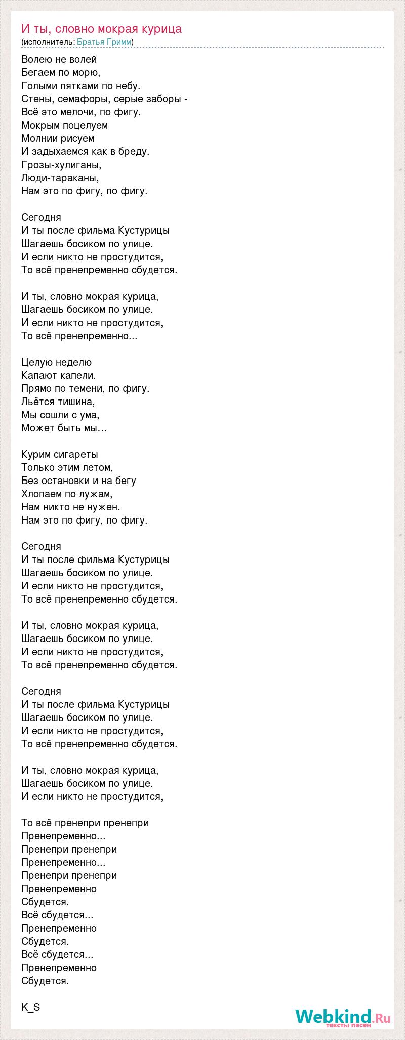 Волею не волей Бегаем по морю, Голыми пятками по небу. Стены, семафоры, серые заборы - Всё это мелочи, по фигу. Мокрым поцелуем Молнии рисуем И задыхаемся как в бреду. Грозы-хулиганы, Люди-тараканы, Нам это по фигу, по фигу. Сегодня И ты после фильма Кустурицы Шагаешь босиком по улице. И если никто не простудится, То всё пренепременно сбудется. И ты, словно мокрая курица, Шагаешь босиком по улице. И если никто не простудится, То всё пренепременно... Целую неделю Капают капели. Прямо по темени, по фигу. Льётся тишина, Мы сошли с ума, Может быть мы… Курим сигареты Только этим летом, Без остановки и на бегу Хлопаем по лужам, Нам никто не нужен. Нам это по фигу, по фигу. Сегодня И ты после фильма Кустурицы Шагаешь босиком по улице. И если никто не простудится, То всё пренепременно сбудется. И ты, словно мокрая курица, Шагаешь босиком по улице. И если никто не простудится, То всё пренепременно сбудется. Сегодня И ты после фильма Кустурицы Шагаешь босиком по улице. И если никто не простудится, То всё пренепременно сбудется. И ты, словно мокрая курица, Шагаешь босиком по улице. И если никто не простудится, То всё пренепри пренепри Пренепременно... Пренепри пренепри Пренепременно... Пренепри пренепри Пренепременно Сбудется. Всё сбудется... Пренепременно Сбудется. Всё сбудется... Пренепременно Сбудется. K_S