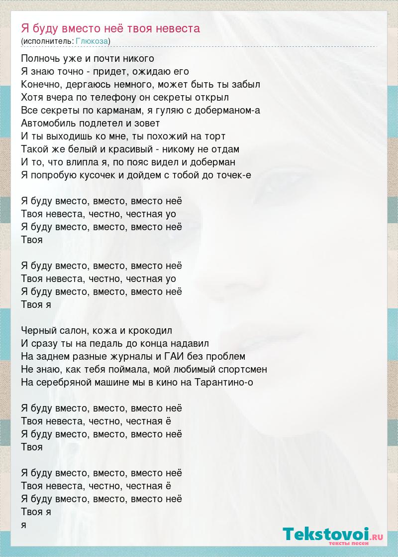 Полночь уже и почти никого Я знаю точно - придет, ожидаю его Конечно, дергаюсь немного, может быть ты забыл Хотя вчера по телефону он секреты открыл Все секреты по карманам, я гуляю с доберманом-а Автомобиль подлетел и зовет И ты выходишь ко мне, ты похожий на торт Такой же белый и красивый - никому не отдам И то, что влипла я, по пояс видел и доберман Я попробую кусочек и дойдем с тобой до точек-е Я буду вместо, вместо, вместо неё Твоя невеста, честно, честная yo Я буду вместо, вместо, вместо неё Твоя Я буду вместо, вместо, вместо неё Твоя невеста, честно, честная yo Я буду вместо, вместо, вместо неё Твоя я Черный салон, кожа и крокодил И сразу ты на педаль до конца надавил На заднем разные журналы и ГАИ без проблем Не знаю, как тебя поймала, мой любимый спортсмен На серебряной машине мы в кино на Тарантино-о Я буду вместо, вместо, вместо неё Твоя невеста, честно, честная ё Я буду вместо, вместо, вместо неё Твоя Я буду вместо, вместо, вместо неё Твоя невеста, честно, честная ё Я буду вместо, вместо, вместо неё Твоя я я