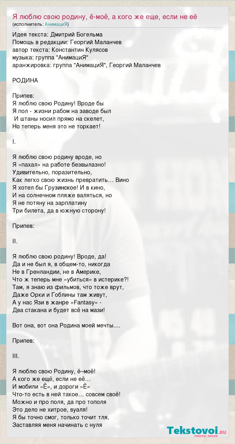 Идея текста: Дмитрий Богельма Помощь в редакции: Георгий Маланчев автор текста: Константин Кулясов музыка: группа "АнимациЯ" аранжировка: группа "АнимациЯ", Георгий Маланчев РОДИНА Припев: Я люблю свою Родину! Вроде бы Я пол - жизни рабом на заводе был И штаны носил прямо на скелет, Но теперь меня это не торкает! I. Я люблю свою родину вроде, но Я «пахал» на работе безвылазно! Удивительно, поразительно, Как легко свою жизнь превратить… Вино Я хотел бы Грузинское! И в кино, И на солнечном пляже валяться, но Я не потяну на зарплатину Три билета, да в южную сторону! Припев: II. Я люблю свою родину! Вроде, да! Да и не был я, в общем-то, никогда Не в Гренландии, не в Америке, Что ж теперь мне «убиться» в истерике?! Там, я знаю из фильмов, что тоже врут, Даже Орки и Гоблины там живут, А у нас Язи в жанре «Fantasy» - Два стакана и будет всё на мази! Вот она, вот она Родина моей мечты.... Припев: III. Я люблю свою Родину, ё–моё! А кого же ещё, если не её… И мобили «Ё», и дороги «Ё» Что-то есть в ней такое… совсем своё! Можно и про поля, да про тополя Это дело не хитрое, вуаля! Я бы точно смог, только точит тля, Заставляя меня начинать с нуля