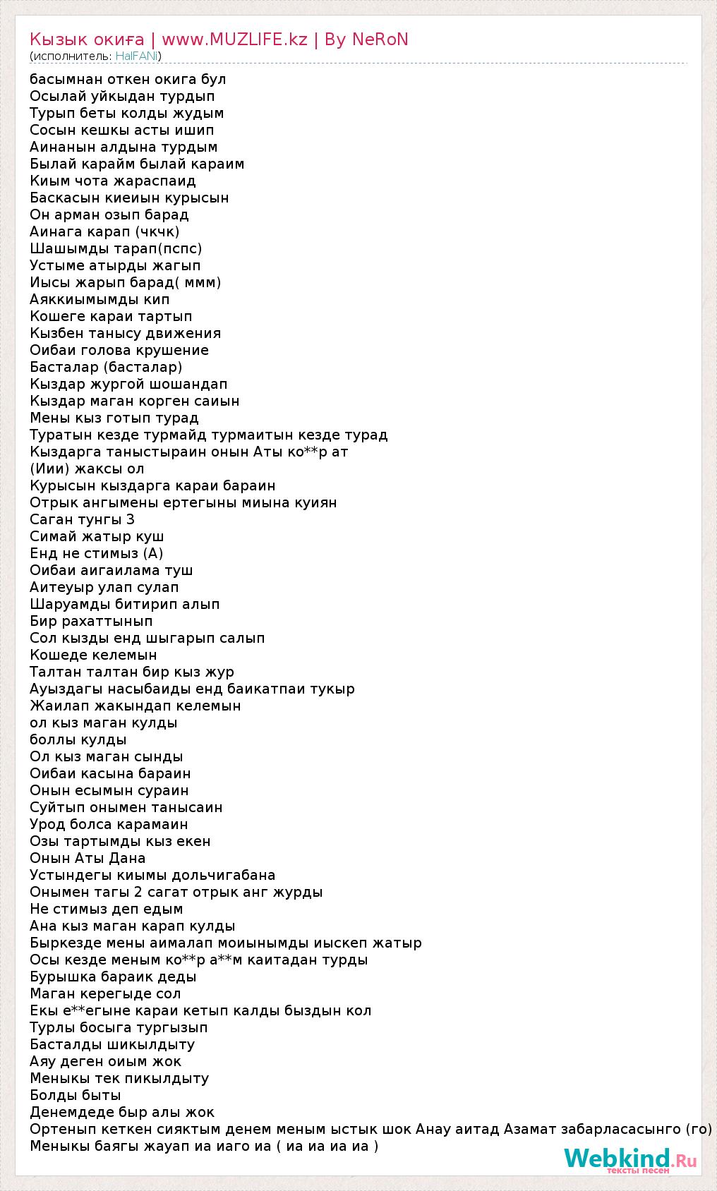 басымнан откен окига бул Осылай уйкыдан турдып Турып беты колды жудым Сосын кешкы асты ишип Аинанын алдына турдым Былай карайм былай караим Киым чота жараспаид Баскасын киеиын курысын Он арман озып барад Аинага карап (чкчк) Шашымды тарап(пспс) Устыме атырды жагып Иысы жарып барад( ммм) Аяккиымымды кип Кошеге караи тартып Кызбен танысу движения Оибаи голова крушение Басталар (басталар) Кыздар жургой шошандап Кыздар маган корген саиын Мены кыз готып турад Туратын кезде турмайд турмаитын кезде турад Кыздарга таныстыраин онын Аты ко**р ат (Иии) жаксы ол Курысын кыздарга караи бараин Отрык ангымены ертегыны миына куиян Саган тунгы 3 Симай жатыр куш Енд не стимыз (А) Оибаи аигаилама туш Аитеуыр улап сулап Шаруамды битирип алып Бир рахаттынып Сол кызды енд шыгарып салып Кошеде келемын Талтан талтан бир кыз жур Ауыздагы насыбаиды енд баикатпаи тукыр Жаилап жакындап келемын ол кыз маган кулды боллы кулды Ол кыз маган сынды Оибаи касына бараин Онын есымын сураин Суйтып онымен танысаин Урод болса карамаин Озы тартымды кыз екен Онын Аты Дана Устындегы киымы дольчигабана Онымен тагы 2 сагат отрык анг журды Не стимыз деп едым Ана кыз маган карап кулды Быркезде мены аималап моиынымды иыскеп жатыр Осы кезде меным ко**р а**м каитадан турды Бурышка бараик деды Маган керегыде сол Екы е**егыне караи кетып калды быздын кол Турлы босыга тургызып Басталды шикылдыту Аяу деген оиым жок Меныкы тек пикылдыту Болды быты Денемдеде быр алы жок Ортенып кеткен сияктым денем меным ыстык шок Анау аитад Азамат забарласасынго (го) Меныкы баягы жауап иа иаго иа ( иа иа иа иа )
