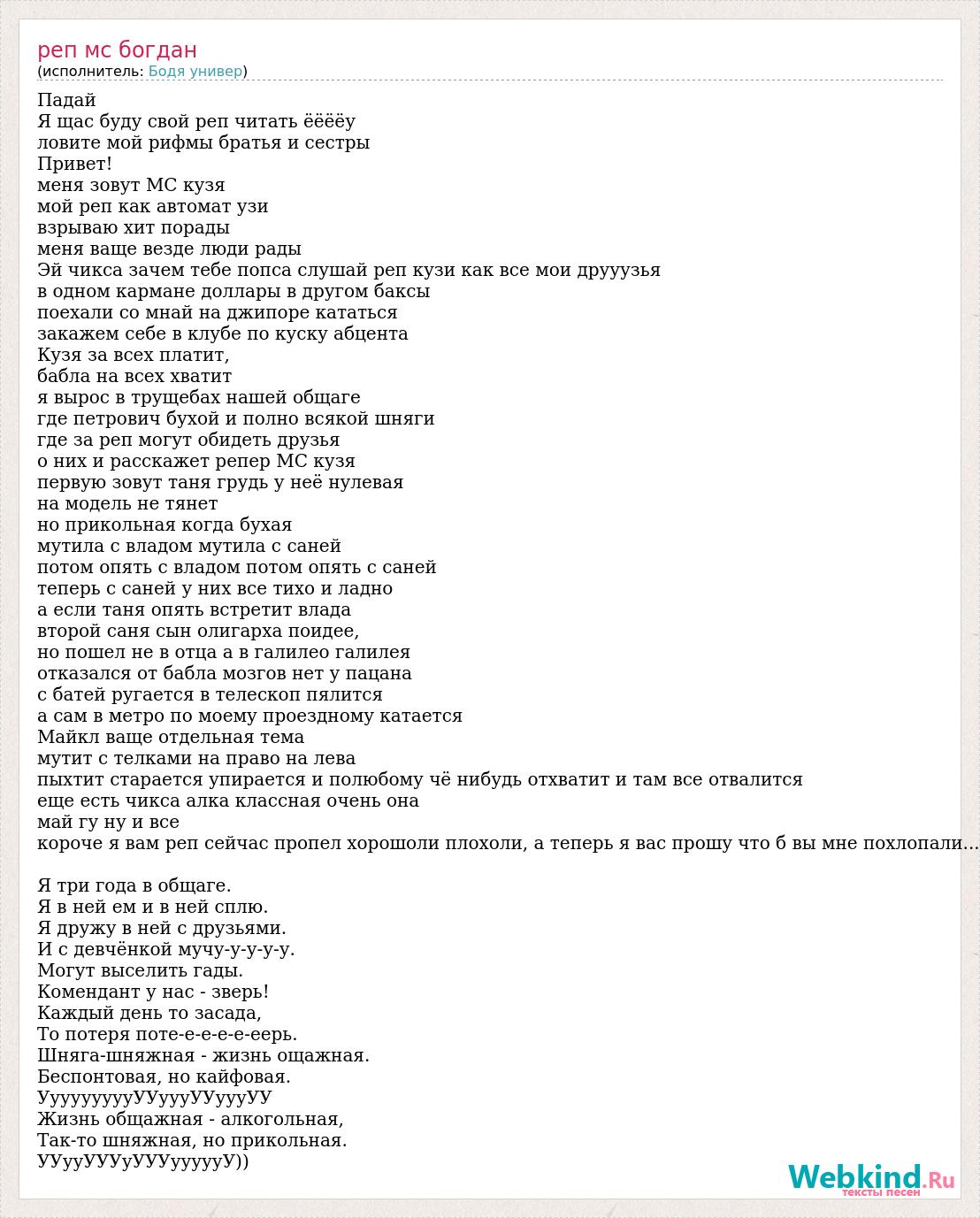 Падай Я щас буду свой реп читать ёёёёу ловите мой рифмы братья и сестры Привет! меня зовут MC кузя мой реп как автомат узи взрываю хит порады меня ваще везде люди рады Эй чикса зачем тебе попса слушай реп кузи как все мои друуузья в одном кармане доллары в другом баксы поехали со мнай на джипоре кататься закажем себе в клубе по куску абцента Кузя за всех платит, бабла на всех хватит я вырос в трущебах нашей общаге где петрович бухой и полно всякой шняги где за реп могут обидеть друзья о них и расскажет репер МС кузя первую зовут таня грудь у неё нулевая на модель не тянет но прикольная когда бухая мутила с владом мутила с саней потом опять с владом потом опять с саней теперь с саней у них все тихо и ладно а если таня опять встретит влада второй саня сын олигарха поидее, но пошел не в отца а в галилео галилея отказался от бабла мозгов нет у пацана с батей ругается в телескоп пялится а сам в метро по моему проездному катается Майкл ваще отдельная тема мутит с телками на право на лева пыхтит старается упирается и полюбому чё нибудь отхватит и там все отвалится еще есть чикса алка классная очень она май гу ну и все короче я вам реп сейчас пропел хорошоли плохоли, а теперь я вас прошу что б вы мне похлопали... Я три года в общаге. Я в ней ем и в ней сплю. Я дружу в ней с друзьями. И с девчёнкой мучу-у-у-у-у. Могут выселить гады. Комендант у нас - зверь! Каждый день то засада, То потеря поте-е-е-е-е-еерь. Шняга-шняжная - жизнь ощажная. Беспонтовая, но кайфовая. УууууууууУУуууУУуууУУ Жизнь общажная - алкогольная, Так-то шняжная, но прикольная. УУууУУУуУУУуууууУ))