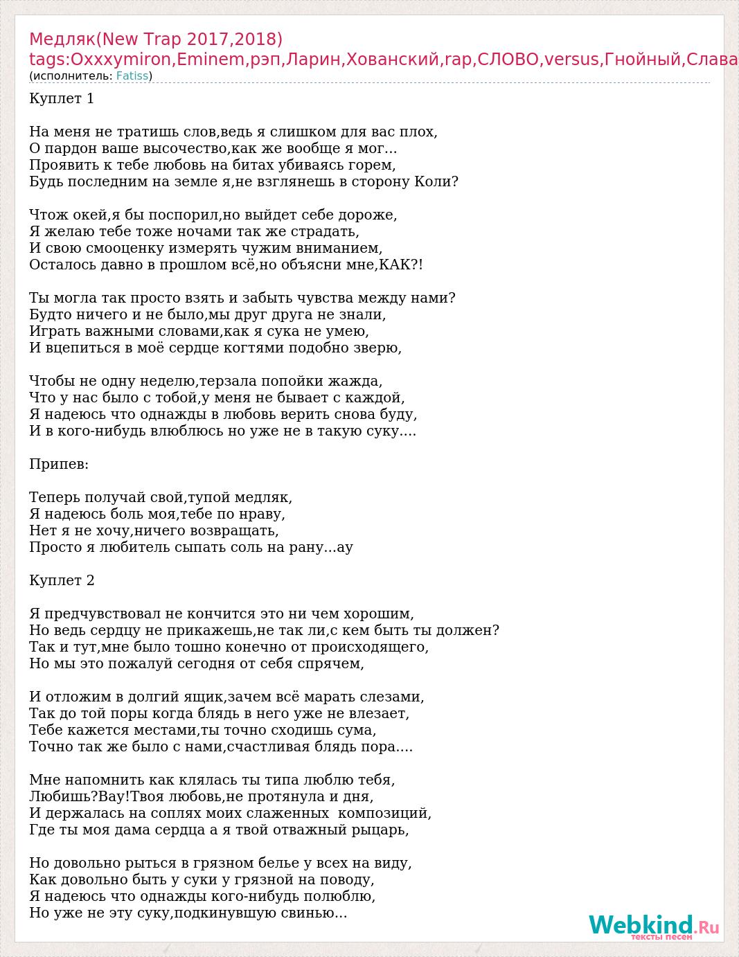 Куплет 1 На меня не тратишь слов,ведь я слишком для вас плох, О пардон ваше высочество,как же вообще я мог... Проявить к тебе любовь на битах убиваясь горем, Будь последним на земле я,не взглянешь в сторону Коли? Чтож окей,я бы поспорил,но выйдет себе дороже, Я желаю тебе тоже ночами так же страдать, И свою смооценку измерять чужим вниманием, Осталось давно в прошлом всё,но объясни мне,КАК?! Ты могла так просто взять и забыть чувства между нами? Будто ничего и не было,мы друг друга не знали, Играть важными словами,как я сука не умею, И вцепиться в моё сердце когтями подобно зверю, Чтобы не одну неделю,терзала попойки жажда, Что у нас было с тобой,у меня не бывает с каждой, Я надеюсь что однажды в любовь верить снова буду, И в кого-нибудь влюблюсь но уже не в такую суку.... Припев: Теперь получай свой,тупой медляк, Я надеюсь боль моя,тебе по нраву, Нет я не хочу,ничего возвращать, Просто я любитель сыпать соль на рану...ау Куплет 2 Я предчувствовал не кончится это ни чем хорошим, Но ведь сердцу не прикажешь,не так ли,с кем быть ты должен? Так и тут,мне было тошно конечно от происходящего, Но мы это пожалуй сегодня от себя спрячем, И отложим в долгий ящик,зачем всё марать слезами, Так до той поры когда блядь в него уже не влезает, Тебе кажется местами,ты точно сходишь сума, Точно так же было с нами,счастливая блядь пора.... Мне напомнить как клялась ты типа люблю тебя, Любишь?Вау!Твоя любовь,не протянула и дня, И держалась на соплях моих слаженных композиций, Где ты моя дама сердца а я твой отважный рыцарь, Но довольно рыться в грязном белье у всех на виду, Как довольно быть у суки у грязной на поводу, Я надеюсь что однажды кого-нибудь полюблю, Но уже не эту суку,подкинувшую свинью...