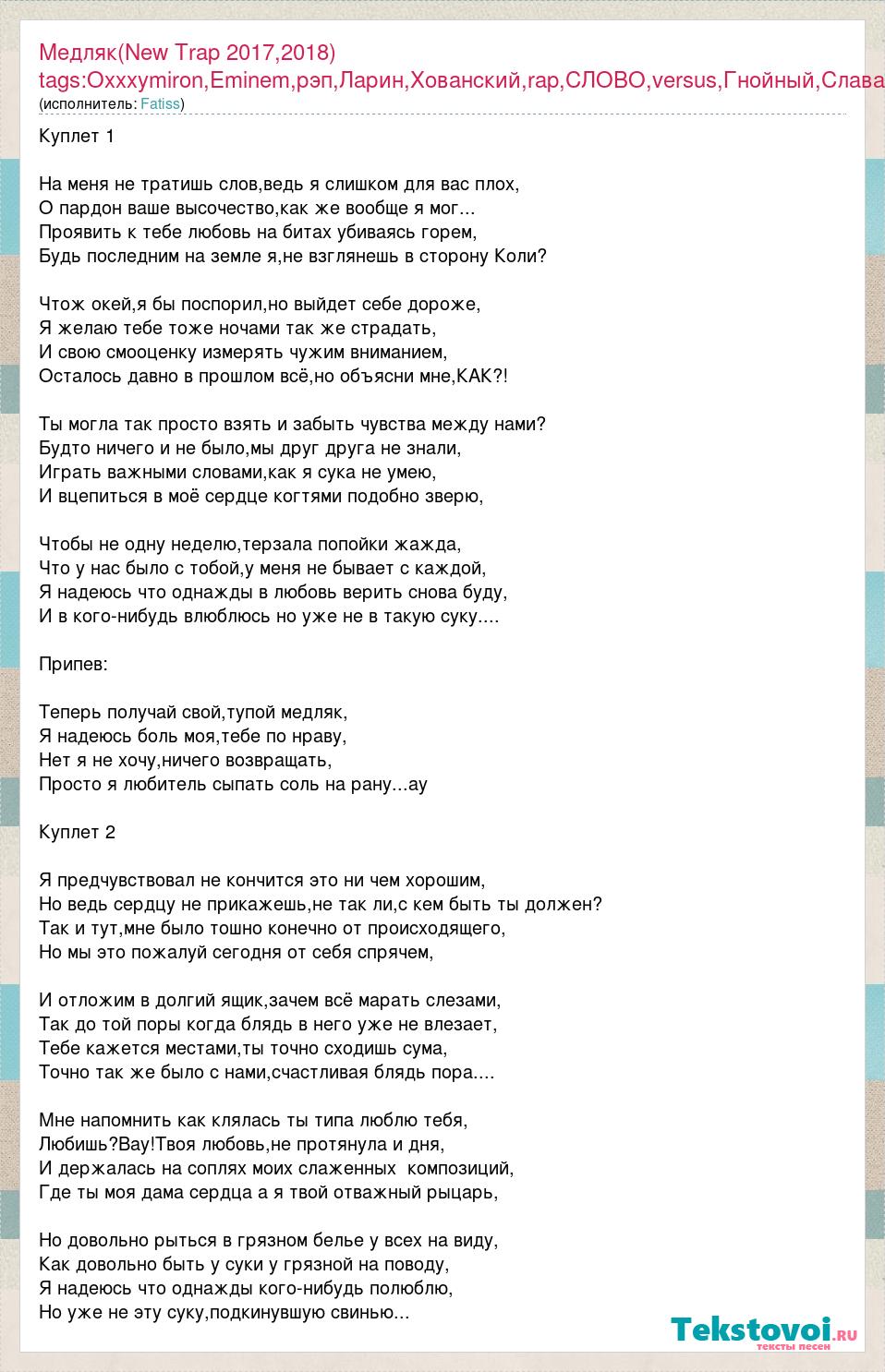 Куплет 1 На меня не тратишь слов,ведь я слишком для вас плох, О пардон ваше высочество,как же вообще я мог... Проявить к тебе любовь на битах убиваясь горем, Будь последним на земле я,не взглянешь в сторону Коли? Чтож окей,я бы поспорил,но выйдет себе дороже, Я желаю тебе тоже ночами так же страдать, И свою смооценку измерять чужим вниманием, Осталось давно в прошлом всё,но объясни мне,КАК?! Ты могла так просто взять и забыть чувства между нами? Будто ничего и не было,мы друг друга не знали, Играть важными словами,как я сука не умею, И вцепиться в моё сердце когтями подобно зверю, Чтобы не одну неделю,терзала попойки жажда, Что у нас было с тобой,у меня не бывает с каждой, Я надеюсь что однажды в любовь верить снова буду, И в кого-нибудь влюблюсь но уже не в такую суку.... Припев: Теперь получай свой,тупой медляк, Я надеюсь боль моя,тебе по нраву, Нет я не хочу,ничего возвращать, Просто я любитель сыпать соль на рану...ау Куплет 2 Я предчувствовал не кончится это ни чем хорошим, Но ведь сердцу не прикажешь,не так ли,с кем быть ты должен? Так и тут,мне было тошно конечно от происходящего, Но мы это пожалуй сегодня от себя спрячем, И отложим в долгий ящик,зачем всё марать слезами, Так до той поры когда блядь в него уже не влезает, Тебе кажется местами,ты точно сходишь сума, Точно так же было с нами,счастливая блядь пора.... Мне напомнить как клялась ты типа люблю тебя, Любишь?Вау!Твоя любовь,не протянула и дня, И держалась на соплях моих слаженных композиций, Где ты моя дама сердца а я твой отважный рыцарь, Но довольно рыться в грязном белье у всех на виду, Как довольно быть у суки у грязной на поводу, Я надеюсь что однажды кого-нибудь полюблю, Но уже не эту суку,подкинувшую свинью...