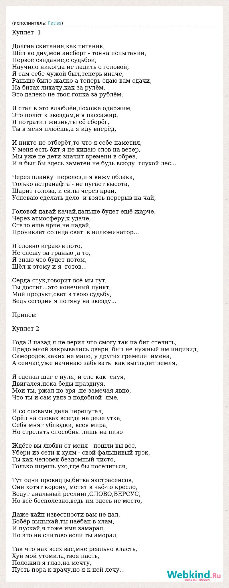 Куплет 1 Долгие скитания,как титаник, Шёл ко дну,мой айсберг - тонна испытаний, Первое свидание,с судьбой, Научило никогда не ладить с головой, Я сам себе чужой был,теперь иначе, Раньше было жалко а теперь сдаю вам сдачи, На битах лихачу,как за рулём, Это далеко не твоя гонка за рублём, Я стал в это влюблён,похоже одержим, Это полёт к звёздам,и я пассажир, Я потратил жизнь,ты её сберёг, Ты в меня плюёшь,а я иду вперёд, И никто не отберёт,то что я себе наметил, У меня есть бит,я не кидаю слов на ветер, Мы уже не дети значит времени в обрез, И я был бы здесь заметен не будь всюду глухой лес... Через планку перелез,и я вижу облака, Только астранафта - не пугает высота, Шарит голова, и силы через край, Успеваю сделать дело и взять перерыв на чай, Головой давай качай,дальше будет ещё жарче, Через атмосферу,к удаче, Стало ещё ярче,не падай, Проникает солнца свет в иллюминатор... Я словно играю в лото, Не слежу за гранью ,а то, Я знаю что будет потом, Шёл к этому и я готов... Серда стук,говорит всё мы тут, Ты достиг...это конечный пункт, Мой продукт,свет в твою судьбу, Ведь сегодня я потяну на звезду... Припев: Куплет 2 Года 3 назад я не верил что смогу так на бит стелить, Предо мной закрывались двери, был не нужный им индивид, Самородок,каких не мало, у других гремели имена, А сейчас,уже начинаю забывать как выглядит земля, Я сделал шаг с нуля, и еле как снуя, Двигался,пока беды празднуя, Мои ты, ржал но зря ,не замечая явно, Что ты и сам увяз в подобной яме, И со словами дела перепутал, Орёл на словах всегда на деле утка, Себя мнят ублюдки, всея мира, Но стрелять способны лишь на пиво Ждёте вы любви от меня - пошли вы все, Убери из сети к хуям - свой фальшивый трэк, Ты как человек бездомный чисто, Только ищешь ухо,где бы поселиться, Тут одни провидцы,битва экстрасенсов, Они хотят корону, метят в чьё-то кресло, Ведут анальный реслинг,СЛОВО,ВЕРСУС, Но всё бесполезно,ведь им здесь не место, Даже хайп известности вам не дал, Бобёр выдыхай,ты наёбан в хлам, И пускай,я тоже имя замарал, Но это не считово если ты аморал, Так что нах всех вас,мне реально класть, Хуй мой утомила,твоя пасть, Положил я глаз,на мечту, Пусть пора к врачу,но я к ней лечу...