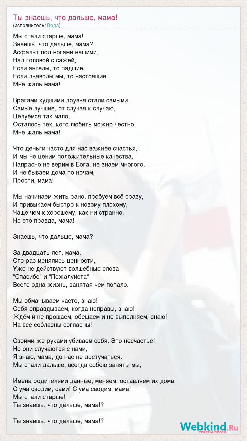 Мы стали старше, мама! Знаешь, что дальше, мама? Асфальт под ногами нашими, Над головой с сажей, Если ангелы, то падшие. Если дьяволы мы, то настоящие. Мне жаль мама! Врагами худшими друзья стали самыми, Самые лучшие, от случая к случаю, Целуемся так мало, Осталось тех, кого любить можно честно. Мне жаль мама! Что деньги часто для нас важнее счастья, И мы не ценим положительные качества, Напрасно не верим в Бога, не знаем многого, И не бываем дома по ночам, Прости, мама! Мы начинаем жить рано, пробуем всё сразу, И привыкаем быстро к новому плохому, Чаще чем к хорошему, как ни странно, Но это правда, мама! Знаешь, что дальше, мама? За двадцать лет, мама, Сто раз менялись ценности, Уже не действуют волшебные слова "Спасибо" и "Пожалуйста" Всего одна жизнь, занятая чем попало. Мы обманываем часто, знаю! Себя оправдываем, когда неправы, знаю! Ждём и не прощаем, обещаем и не выполняем, знаю! На все соблазны согласны! Своими же руками убиваем себя. Это несчастье! Но они случаются с нами, Я знаю, мама, до нас не достучаться. Мы стали дальше, всегда собою заняты мы, Имена родителями данные, меняем, оставляем их дома, С ума сводим, сами! С ума сводим, мама! Мы стали старше! Ты знаешь, что дальше, мама!? Ты знаешь, что дальше, мама!?