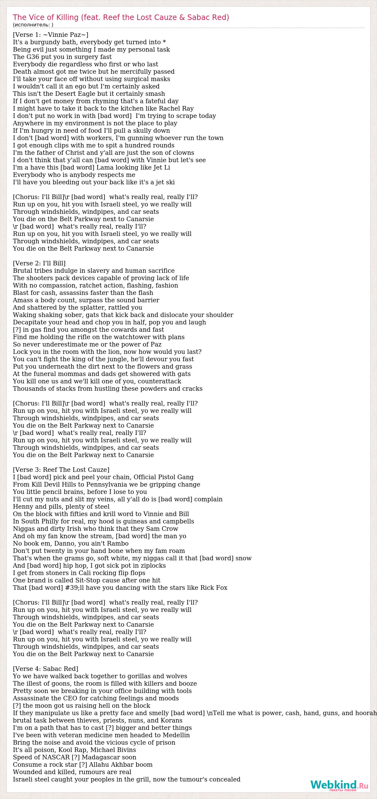 Главная→Исполнители→Ill Bill and Vinnie Paz feat Reef the Lost Cauze and→The Vice of Killing (feat. Reef the Lost Cauze & Sabac Red)