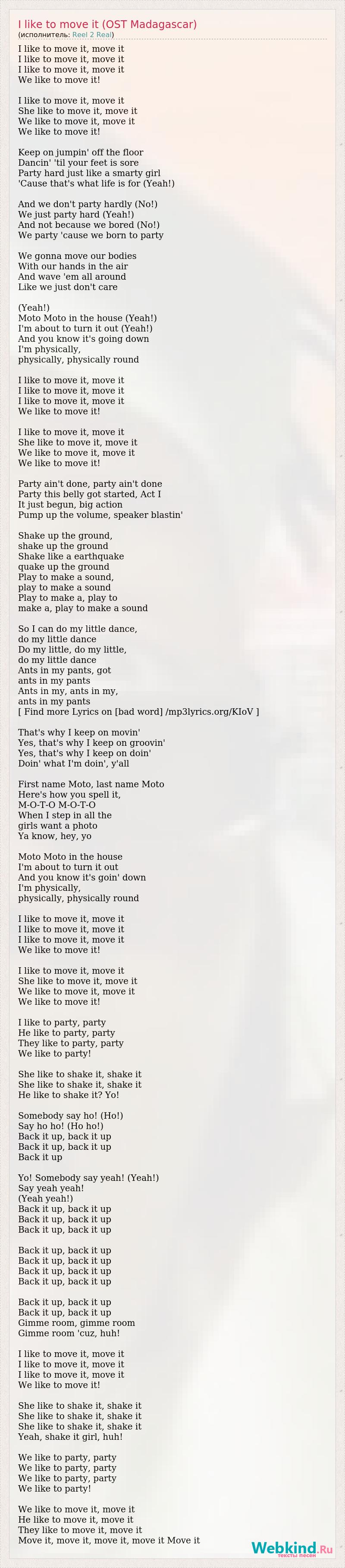 I like to move it, move it I like to move it, move it I like to move it, move it We like to move it! I like to move it, move it She like to move it, move it We like to move it, move it We like to move it! Keep on jumpin' off the floor Dancin' 'til your feet is sore Party hard just like a smarty girl 'Cause that's what life is for (Yeah!) And we don't party hardly (No!) We just party hard (Yeah!) And not because we bored (No!) We party 'cause we born to party We gonna move our bodies With our hands in the air And wave 'em all around Like we just don't care (Yeah!) Moto Moto in the house (Yeah!) I'm about to turn it out (Yeah!) And you know it's going down I'm physically, physically, physically round I like to move it, move it I like to move it, move it I like to move it, move it We like to move it! I like to move it, move it She like to move it, move it We like to move it, move it We like to move it! Party ain't done, party ain't done Party this belly got started, Act I It just begun, big action Pump up the volume, speaker blastin' Shake up the ground, shake up the ground Shake like a earthquake quake up the ground Play to make a sound, play to make a sound Play to make a, play to make a, play to make a sound So I can do my little dance, do my little dance Do my little, do my little, do my little dance Ants in my pants, got ants in my pants Ants in my, ants in my, ants in my pants [ Find more Lyrics on [bad word] /mp3lyrics.org/KIoV ] That's why I keep on movin' Yes, that's why I keep on groovin' Yes, that's why I keep on doin' Doin' what I'm doin', y'all First name Moto, last name Moto Here's how you spell it, M-O-T-O M-O-T-O When I step in all the girls want a photo Ya know, hey, yo Moto Moto in the house I'm about to turn it out And you know it's goin' down I'm physically, physically, physically round I like to move it, move it I like to move it, move it I like to move it, move it We like to move it! I like to move it, move it She like to move it, move it We like to move it, move it We like to move it! I like to party, party He like to party, party They like to party, party We like to party! She like to shake it, shake it She like to shake it, shake it He like to shake it? Yo! Somebody say ho! (Ho!) Say ho ho! (Ho ho!) Back it up, back it up Back it up, back it up Back it up Yo! Somebody say yeah! (Yeah!) Say yeah yeah! (Yeah yeah!) Back it up, back it up Back it up, back it up Back it up, back it up Back it up, back it up Back it up, back it up Back it up, back it up Back it up, back it up Back it up, back it up Back it up, back it up Gimme room, gimme room Gimme room 'cuz, huh! I like to move it, move it I like to move it, move it I like to move it, move it We like to move it! She like to shake it, shake it She like to shake it, shake it She like to shake it, shake it Yeah, shake it girl, huh! We like to party, party We like to party, party We like to party, party We like to party! We like to move it, move it He like to move it, move it They like to move it, move it Move it, move it, move it, move it Move it