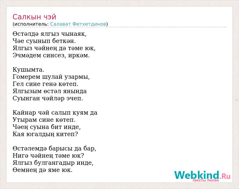 Өстәлдә ялгыз чынаяк, Чәе суынып беткән. Ялгыз чәйнең дә тәме юк, Эчмәдем синсез, иркәм. Кушымта. Гомерем шулай узармы, Гел сине генә көтеп. Ялгызым өстәл янында Суынган чәйләр эчеп. Кайнар чәй салып куям да Утырам сине көтеп. Чәең суына бит инде, Кая югалдың китеп? Өстәлемдә барысы да бар, Нигә чәйнең тәме юк? Ялгыз булгангадыр инде, Өемнең дә яме юк.
