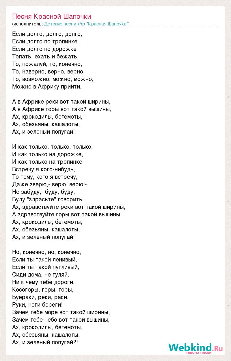 Если долго, долго, долго, Если долго по тропинке , Если долго по дорожке Топать, ехать и бежать, То, пожалуй, то, конечно, То, наверно, верно, верно, То, возможно, можно, можно, Можно в Африку прийти. А в Африке реки вот такой ширины, А в Африке горы вот такой вышины, Ах, крокодилы, бегемоты, Ах, обезьяны, кашалоты, Ах, и зеленый попугай! И как только, только, только, И как только на дорожке, И как только на тропинке Встречу я кого-нибудь, То тому, кого я встречу,- Даже зверю,- верю, верю,- Не забуду,- буду, буду, Буду "здрасьте" говорить. Ах, здравствуйте реки вот такой ширины, А здравствуйте горы вот такой вышины, Ах, крокодилы, бегемоты, Ах, обезьяны, кашалоты, Ах, и зеленый попугай! Но, конечно, но, конечно, Если ты такой ленивый, Если ты такой пугливый, Сиди дома, не гуляй. Ни к чему тебе дороги, Косогоры, горы, горы, Буераки, реки, раки. Руки, ноги береги! Зачем тебе море вот такой ширины, Зачем тебе небо вот такой вышины, Ах, крокодилы, бегемоты, Ах, обезьяны, кашалоты, Ах, и зеленый попугай?!