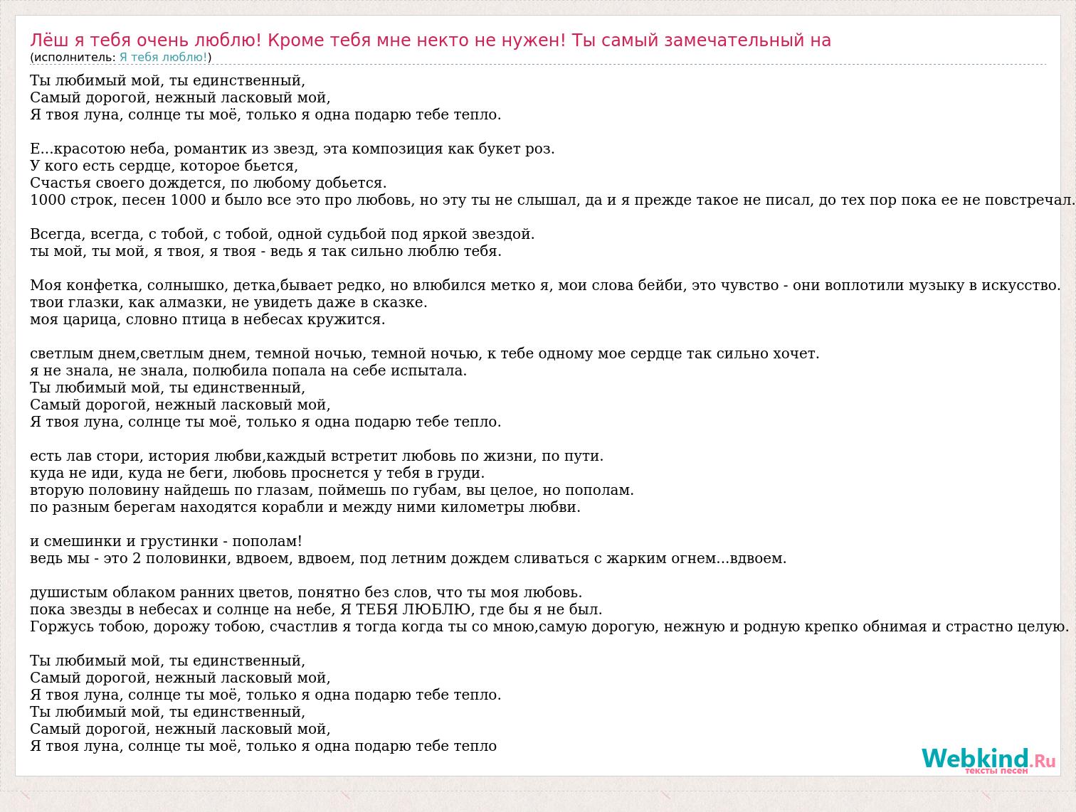 Ты любимый мой, ты единственный, Самый дорогой, нежный ласковый мой, Я твоя луна, солнце ты моё, только я одна подарю тебе тепло. Е...красотою неба, романтик из звезд, эта композиция как букет роз. У кого есть сердце, которое бьется, Счастья своего дождется, по любому добьется. 1000 строк, песен 1000 и было все это про любовь, но эту ты не слышал, да и я прежде такое не писал, до тех пор пока ее не повстречал. Всегда, всегда, с тобой, с тобой, одной судьбой под яркой звездой. ты мой, ты мой, я твоя, я твоя - ведь я так сильно люблю тебя. Моя конфетка, солнышко, детка,бывает редко, но влюбился метко я, мои слова бейби, это чувство - они воплотили музыку в искусство. твои глазки, как алмазки, не увидеть даже в сказке. моя царица, словно птица в небесах кружится. светлым днем,светлым днем, темной ночью, темной ночью, к тебе одному мое сердце так сильно хочет. я не знала, не знала, полюбила попала на себе испытала. Ты любимый мой, ты единственный, Самый дорогой, нежный ласковый мой, Я твоя луна, солнце ты моё, только я одна подарю тебе тепло. есть лав стори, история любви,каждый встретит любовь по жизни, по пути. куда не иди, куда не беги, любовь проснется у тебя в груди. вторую половину найдешь по глазам, поймешь по губам, вы целое, но пополам. по разным берегам находятся корабли и между ними километры любви. и смешинки и грустинки - пополам! ведь мы - это 2 половинки, вдвоем, вдвоем, под летним дождем сливаться с жарким огнем...вдвоем. душистым облаком ранних цветов, понятно без слов, что ты моя любовь. пока звезды в небесах и солнце на небе, Я ТЕБЯ ЛЮБЛЮ, где бы я не был. Горжусь тобою, дорожу тобою, счастлив я тогда когда ты со мною,самую дорогую, нежную и родную крепко обнимая и страстно целую. Ты любимый мой, ты единственный, Самый дорогой, нежный ласковый мой, Я твоя луна, солнце ты моё, только я одна подарю тебе тепло. Ты любимый мой, ты единственный, Самый дорогой, нежный ласковый мой, Я твоя луна, солнце ты моё, только я одна подарю тебе тепло