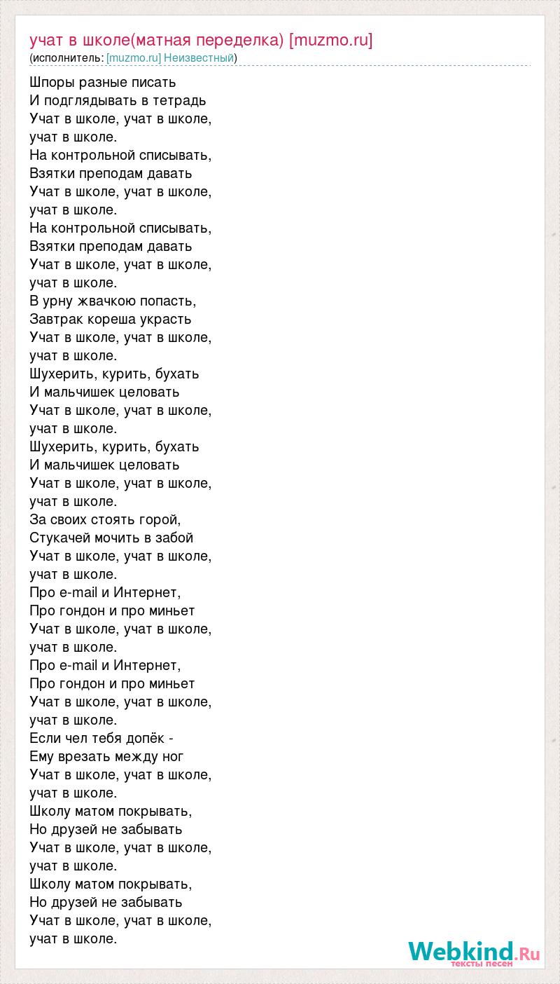 Шпоры разные писать И подглядывать в тетрадь Учат в школе, учат в школе, учат в школе. На контрольной списывать, Взятки преподам давать Учат в школе, учат в школе, учат в школе. На контрольной списывать, Взятки преподам давать Учат в школе, учат в школе, учат в школе. В урну жвачкою попасть, Завтрак кореша украсть Учат в школе, учат в школе, учат в школе. Шухерить, курить, бухать И мальчишек целовать Учат в школе, учат в школе, учат в школе. Шухерить, курить, бухать И мальчишек целовать Учат в школе, учат в школе, учат в школе. За своих стоять горой, Стукачей мочить в забой Учат в школе, учат в школе, учат в школе. Про e-mail и Интернет, Про гондон и про миньет Учат в школе, учат в школе, учат в школе. Про e-mail и Интернет, Про гондон и про миньет Учат в школе, учат в школе, учат в школе. Если чел тебя допёк - Ему врезать между ног Учат в школе, учат в школе, учат в школе. Школу матом покрывать, Но друзей не забывать Учат в школе, учат в школе, учат в школе. Школу матом покрывать, Но друзей не забывать Учат в школе, учат в школе, учат в школе.
