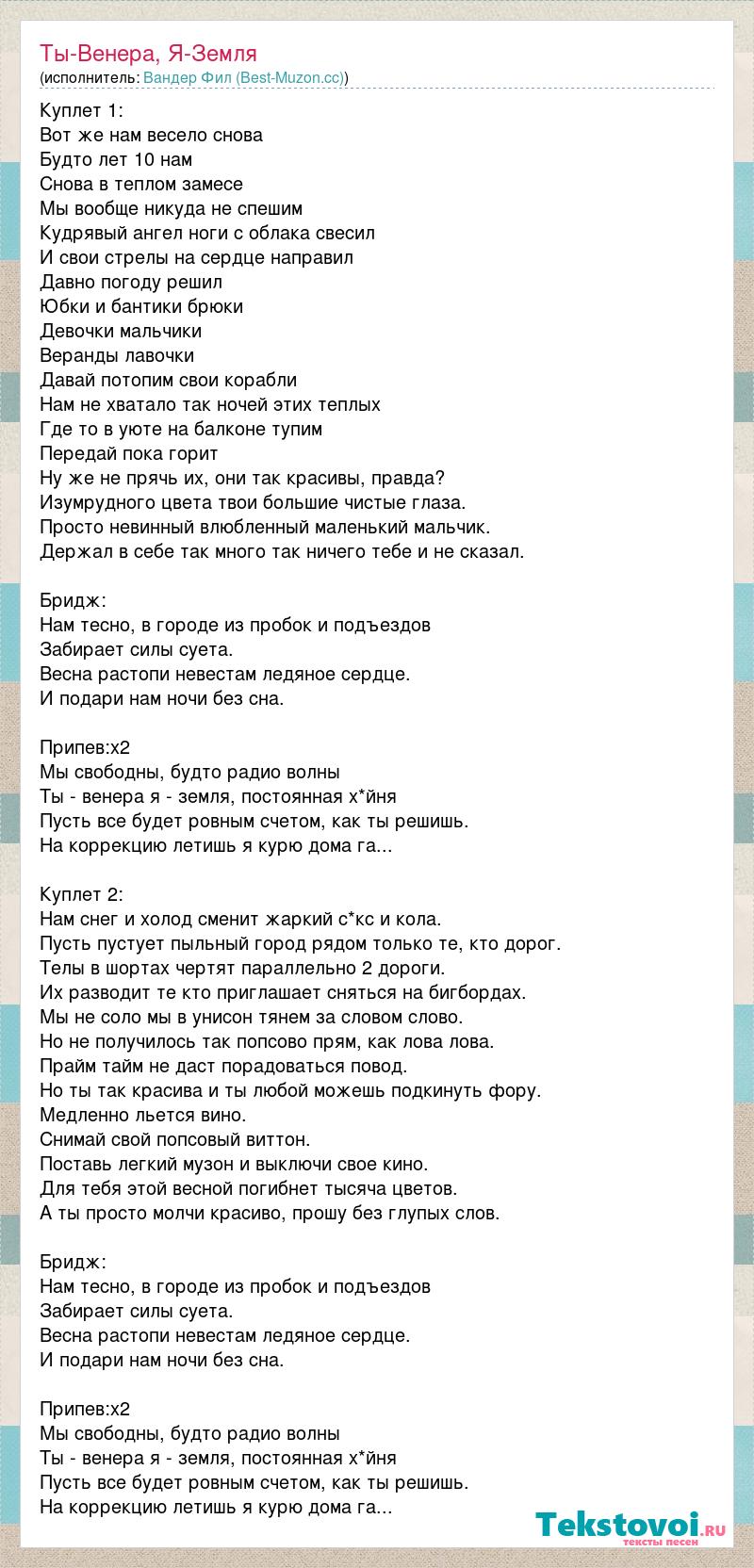 Куплет 1: Вот же нам весело снова Будто лет 10 нам Снова в теплом замесе Мы вообще никуда не спешим Кудрявый ангел ноги с облака свесил И свои стрелы на сердце направил Давно погоду решил Юбки и бантики брюки Девочки мальчики Веранды лавочки Давай потопим свои корабли Нам не хватало так ночей этих теплых Где то в уюте на балконе тупим Передай пока горит Ну же не прячь их, они так красивы, правда? Изумрудного цвета твои большие чистые глаза. Просто невинный влюбленный маленький мальчик. Держал в себе так много так ничего тебе и не сказал. Бридж: Нам тесно, в городе из пробок и подъездов Забирает силы суета. Весна растопи невестам ледяное сердце. И подари нам ночи без сна. Припев:х2 Мы свободны, будто радио волны Ты - венера я - земля, постоянная х*йня Пусть все будет ровным счетом, как ты решишь. На коррекцию летишь я курю дома га... Куплет 2: Нам снег и холод сменит жаркий с*кс и кола. Пусть пустует пыльный город рядом только те, кто дорог. Телы в шортах чертят параллельно 2 дороги. Их разводит те кто приглашает сняться на бигбордах. Мы не соло мы в унисон тянем за словом слово. Но не получилось так попсово прям, как лова лова. Прайм тайм не даст порадоваться повод. Но ты так красива и ты любой можешь подкинуть фору. Медленно льется вино. Снимай свой попсовый виттон. Поставь легкий музон и выключи свое кино. Для тебя этой весной погибнет тысяча цветов. А ты просто молчи красиво, прошу без глупых слов. Бридж: Нам тесно, в городе из пробок и подъездов Забирает силы суета. Весна растопи невестам ледяное сердце. И подари нам ночи без сна. Припев:х2 Мы свободны, будто радио волны Ты - венера я - земля, постоянная х*йня Пусть все будет ровным счетом, как ты решишь. На коррекцию летишь я курю дома га...