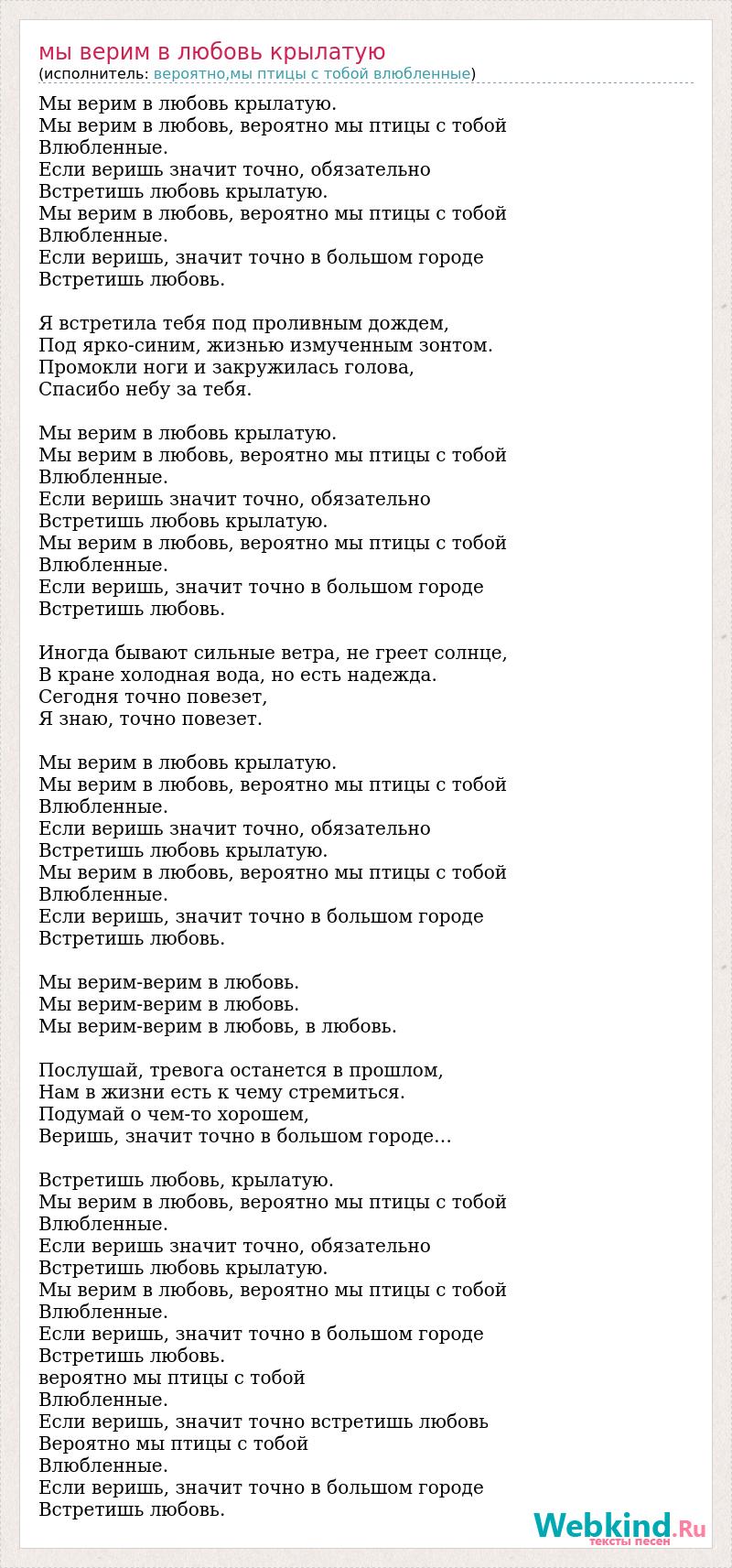 Мы верим в любовь крылатую. Мы верим в любовь, вероятно мы птицы с тобой Влюбленные. Если веришь значит точно, обязательно Встретишь любовь крылатую. Мы верим в любовь, вероятно мы птицы с тобой Влюбленные. Если веришь, значит точно в большом городе Встретишь любовь. Я встретила тебя под проливным дождем, Под ярко-синим, жизнью измученным зонтом. Промокли ноги и закружилась голова, Спасибо небу за тебя. Мы верим в любовь крылатую. Мы верим в любовь, вероятно мы птицы с тобой Влюбленные. Если веришь значит точно, обязательно Встретишь любовь крылатую. Мы верим в любовь, вероятно мы птицы с тобой Влюбленные. Если веришь, значит точно в большом городе Встретишь любовь. Иногда бывают сильные ветра, не греет солнце, В кране холодная вода, но есть надежда. Сегодня точно повезет, Я знаю, точно повезет. Мы верим в любовь крылатую. Мы верим в любовь, вероятно мы птицы с тобой Влюбленные. Если веришь значит точно, обязательно Встретишь любовь крылатую. Мы верим в любовь, вероятно мы птицы с тобой Влюбленные. Если веришь, значит точно в большом городе Встретишь любовь. Мы верим-верим в любовь. Мы верим-верим в любовь. Мы верим-верим в любовь, в любовь. Послушай, тревога останется в прошлом, Нам в жизни есть к чему стремиться. Подумай о чем-то хорошем, Веришь, значит точно в большом городе… Встретишь любовь, крылатую. Мы верим в любовь, вероятно мы птицы с тобой Влюбленные. Если веришь значит точно, обязательно Встретишь любовь крылатую. Мы верим в любовь, вероятно мы птицы с тобой Влюбленные. Если веришь, значит точно в большом городе Встретишь любовь. вероятно мы птицы с тобой Влюбленные. Если веришь, значит точно встретишь любовь Вероятно мы птицы с тобой Влюбленные. Если веришь, значит точно в большом городе Встретишь любовь.
