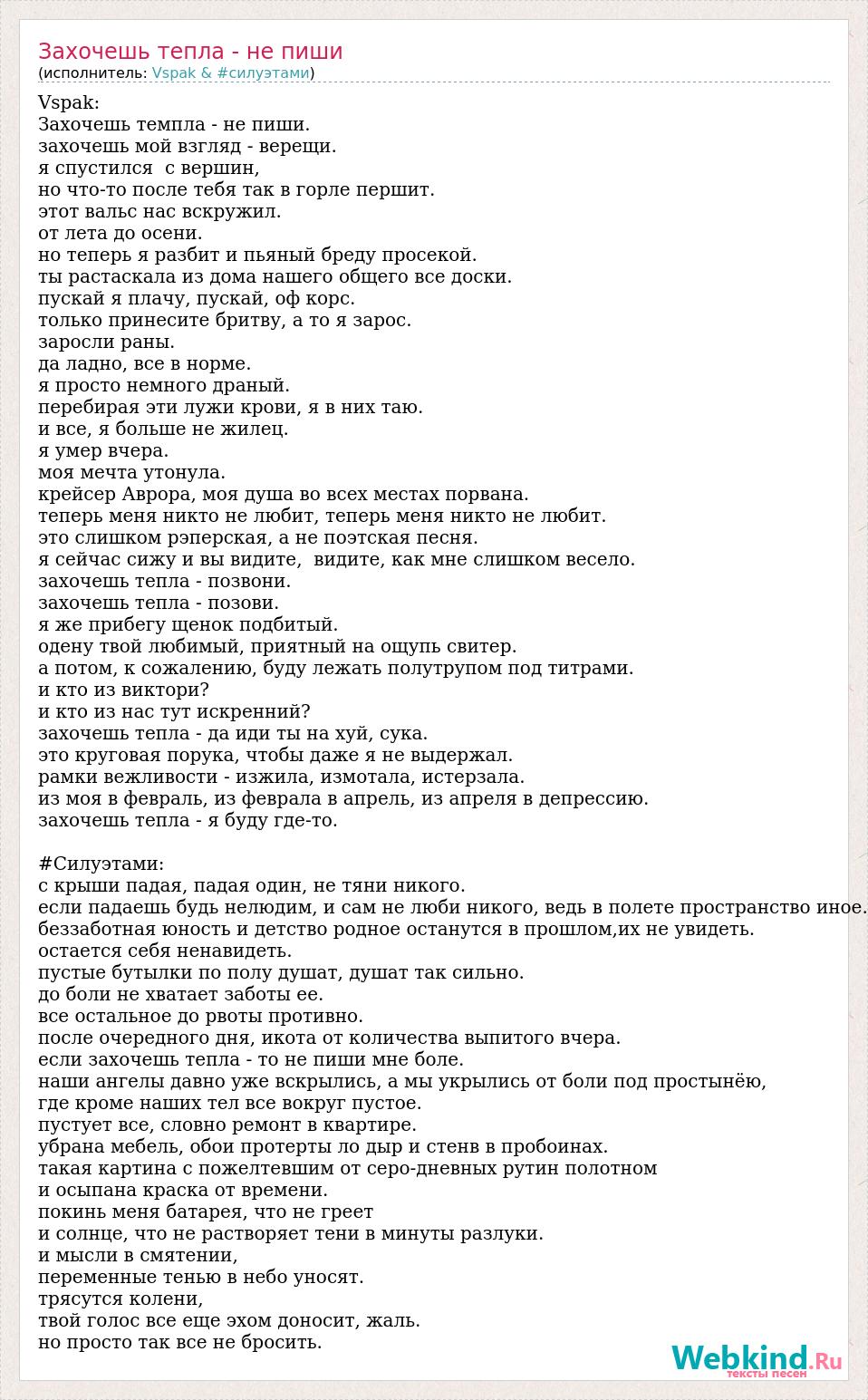 Vspak: Захочешь темпла - не пиши. захочешь мой взгляд - верещи. я спустился с вершин, но что-то после тебя так в горле першит. этот вальс нас вскружил. от лета до осени. но теперь я разбит и пьяный бреду просекой. ты растаскала из дома нашего общего все доски. пускай я плачу, пускай, оф корс. только принесите бритву, а то я зарос. заросли раны. да ладно, все в норме. я просто немного драный. перебирая эти лужи крови, я в них таю. и все, я больше не жилец. я умер вчера. моя мечта утонула. крейсер Аврора, моя душа во всех местах порвана. теперь меня никто не любит, теперь меня никто не любит. это слишком рэперская, а не поэтская песня. я сейчас сижу и вы видите, видите, как мне слишком весело. захочешь тепла - позвони. захочешь тепла - позови. я же прибегу щенок подбитый. одену твой любимый, приятный на ощупь свитер. а потом, к сожалению, буду лежать полутрупом под титрами. и кто из виктори? и кто из нас тут искренний? захочешь тепла - да иди ты на хуй, сука. это круговая порука, чтобы даже я не выдержал. рамки вежливости - изжила, измотала, истерзала. из моя в февраль, из феврала в апрель, из апреля в депрессию. захочешь тепла - я буду где-то. #Силуэтами: с крыши падая, падая один, не тяни никого. если падаешь будь нелюдим, и сам не люби никого, ведь в полете пространство иное. беззаботная юность и детство родное останутся в прошлом,их не увидеть. остается себя ненавидеть. пустые бутылки по полу душат, душат так сильно. до боли не хватает заботы ее. все остальное до рвоты противно. после очередного дня, икота от количества выпитого вчера. если захочешь тепла - то не пиши мне боле. наши ангелы давно уже вскрылись, а мы укрылись от боли под простынёю, где кроме наших тел все вокруг пустое. пустует все, словно ремонт в квартире. убрана мебель, обои протерты ло дыр и стенв в пробоинах. такая картина с пожелтевшим от серо-дневных рутин полотном и осыпана краска от времени. покинь меня батарея, что не греет и солнце, что не растворяет тени в минуты разлуки. и мысли в смятении, переменные тенью в небо уносят. трясутся колени, твой голос все еще эхом доносит, жаль. но просто так все не бросить.