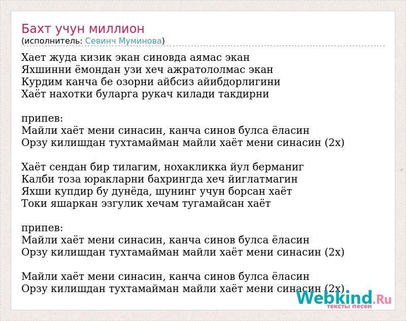 Хает жуда кизик экан синовда аямас экан Яхшинни ёмондан узи хеч ажратололмас экан Курдим канча бе озорни айбсиз айибдорлигини Хаёт нахотки буларга рукач килади такдирни припев: Майли хаёт мени синасин, канча синов булса ёласин Орзу килишдан тухтамайман майли хаёт мени синасин (2х) Хаёт сендан бир тилагим, нохакликка йул берманиг Калби тоза юракларни бахрингда хеч йиглатмагин Яхши купдир бу дунёда, шунинг учун борсан хаёт Токи яшаркан эзгулик хечам тугамайсан хаёт припев: Майли хаёт мени синасин, канча синов булса ёласин Орзу килишдан тухтамайман майли хаёт мени синасин (2х) Майли хаёт мени синасин, канча синов булса ёласин Орзу килишдан тухтамайман майли хаёт мени синасин (2х)