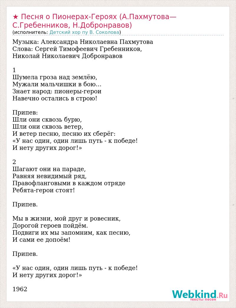 Музыка: Александра Николаевна Пахмутова Слова: Сергей Тимофеевич Гребенников, Николай Николаевич Добронравов 1 Шумела гроза над землёю, Мужали мальчишки в бою… Знает народ: пионеры-герои Навечно остались в строю! Припев: Шли они сквозь бурю, Шли они сквозь ветер, И ветер песню, песню их сберёг: «У нас один, один лишь путь - к победе! И нету других дорог!» 2 Шагают они на параде, Равняя невидимый ряд, Правофланговыми в каждом отряде Ребята-герои стоят! Припев. Мы в жизни, мой друг и ровесник, Дорогой героев пойдём. Подвиги их мы запомним, как песню, И сами ее допоём! Припев. «У нас один, один лишь путь - к победе! И нету других дорог!» 1962