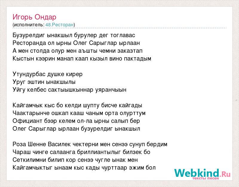Бузурелдиг ынакшыл бурулер дег тоглавас Ресторанда ол ырны Олег Сарыглар ырлаан А мен столда олур мен аъшты чемни заказтап Кыстын кээрин манап каап кызыл вино пактадым Утундурбас душке кирер Уруг эштин ынакшылы Уйгу келбес сактыышкыннар уяранчыын Кайгамчык кыс бо келди шупту бисче кайгады Чаактарынче ошкап кааш чаным орта олурттум Официант бээр келем ол-ла ырны салып бер Олег Сарыглар ырлаан бузурелдиг ынакшыл Роза Шенне Василек чектерни мен сенээ сунуп бердим Чараш чинге салаанга бриллиантылыг билзек бо Сеткилимни билип кор сенээ чугле ынак мен Кайгамчыктыг ынаам кыс кады чурттаар эжим бол
