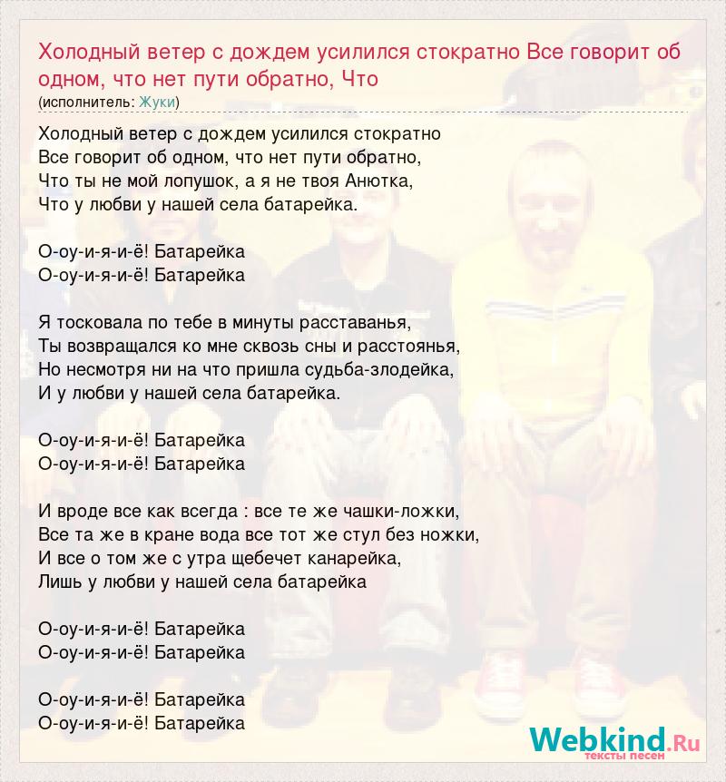 Холодный ветер с дождем усилился стократно Все говорит об одном, что нет пути обратно, Что ты не мой лопушок, а я не твоя Анютка, Что у любви у нашей села батарейка. О-оу-и-я-и-ё! Батарейка О-оу-и-я-и-ё! Батарейка Я тосковала по тебе в минуты расставанья, Ты возвращался ко мне сквозь сны и расстоянья, Но несмотря ни на что пришла судьба-злодейка, И у любви у нашей села батарейка. О-оу-и-я-и-ё! Батарейка О-оу-и-я-и-ё! Батарейка И вроде все как всегда : все те же чашки-ложки, Все та же в кране вода все тот же стул без ножки, И все о том же с утра щебечет канарейка, Лишь у любви у нашей села батарейка О-оу-и-я-и-ё! Батарейка О-оу-и-я-и-ё! Батарейка О-оу-и-я-и-ё! Батарейка О-оу-и-я-и-ё! Батарейка