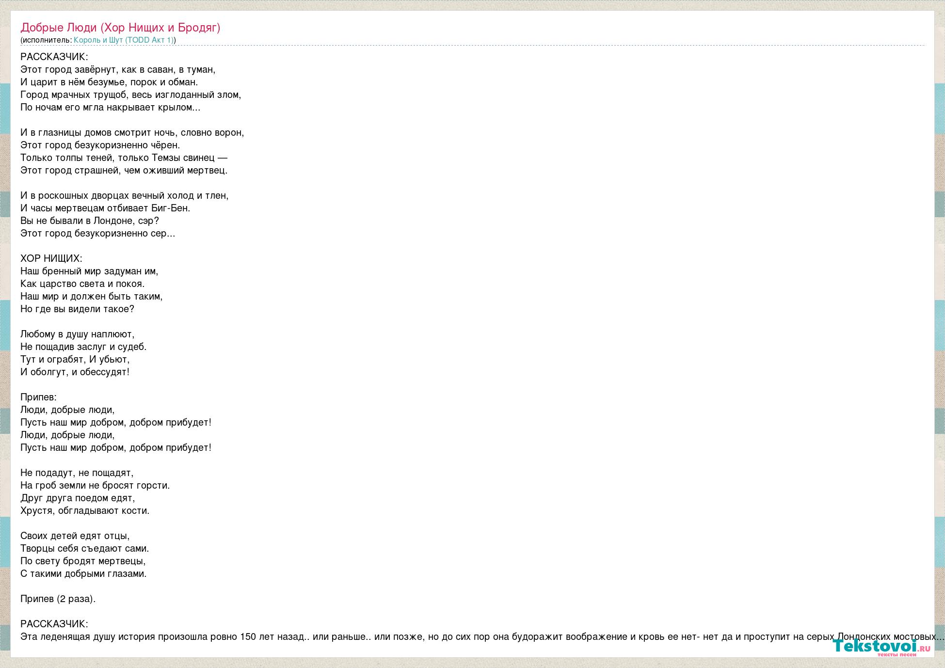 РАССКАЗЧИК: Этот город завёрнут, как в саван, в туман, И царит в нём безумье, порок и обман. Город мрачных трущоб, весь изглоданный злом, По ночам его мгла накрывает крылом... И в глазницы домов смотрит ночь, словно ворон, Этот город безукоризненно чёрен. Только толпы теней, только Темзы свинец — Этот город страшней, чем оживший мертвец. И в роскошных дворцах вечный холод и тлен, И часы мертвецам отбивает Биг-Бен. Вы не бывали в Лондоне, сэр? Этот город безукоризненно сер... ХОР НИЩИХ: Наш бренный мир задуман им, Как царство света и покоя. Наш мир и должен быть таким, Но где вы видели такое? Любому в душу наплюют, Не пощадив заслуг и судеб. Тут и ограбят, И убьют, И оболгут, и обессудят! Припев: Люди, добрые люди, Пусть наш мир добром, добром прибудет! Люди, добрые люди, Пусть наш мир добром, добром прибудет! Не подадут, не пощадят, На гроб земли не бросят горсти. Друг друга поедом едят, Хрустя, обгладывают кости. Своих детей едят отцы, Творцы себя съедают сами. По свету бродят мертвецы, С такими добрыми глазами. Припев (2 раза). РАССКАЗЧИК: Эта леденящая душу история произошла ровно 150 лет назад.. или раньше.. или позже, но до сих пор она будоражит воображение и кровь ее нет- нет да и проступит на серых Лондонских мостовых...