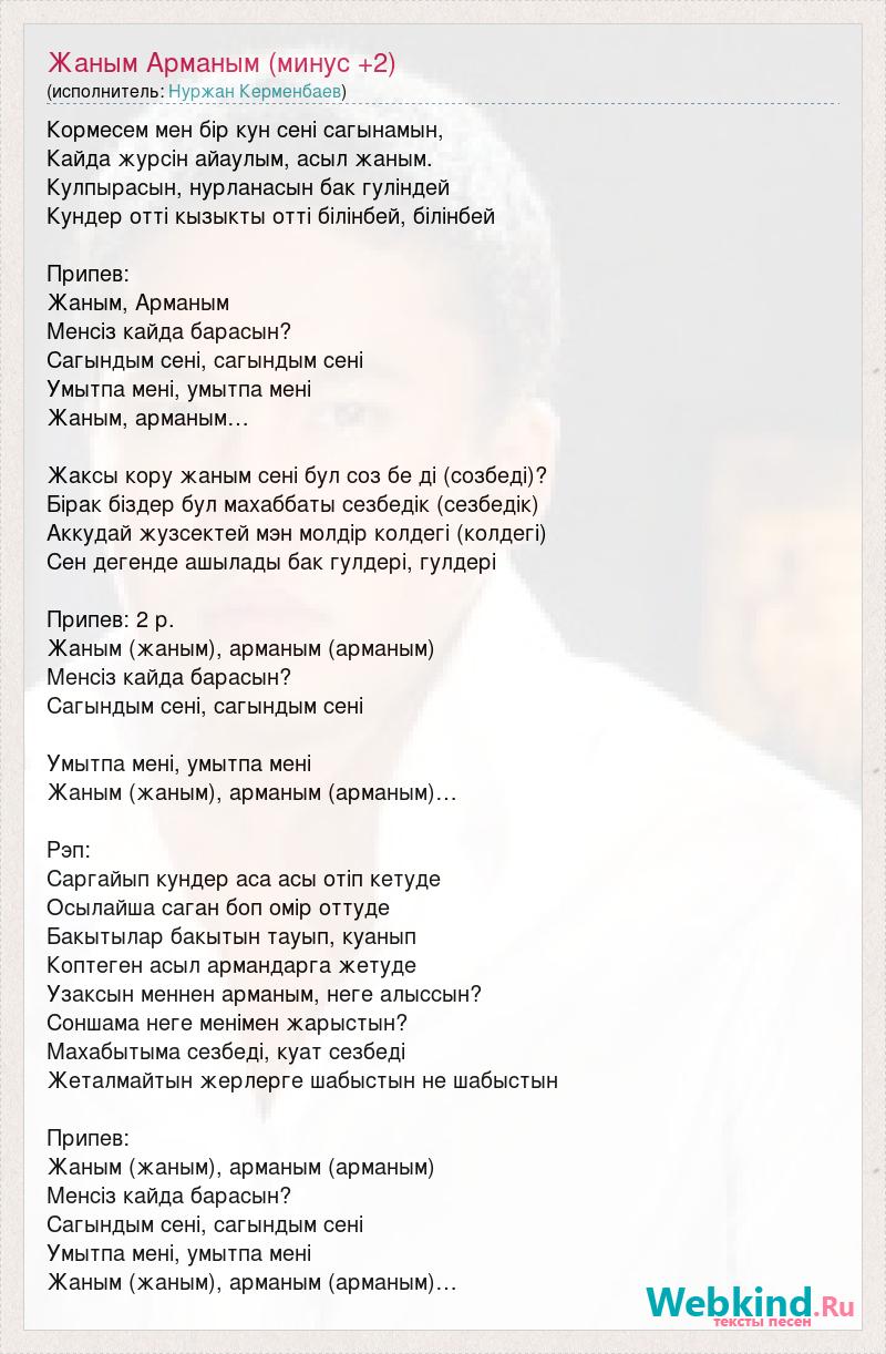 Кормесем мен бiр кун сенi сагынамын, Кайда журсiн айаулым, асыл жаным. Кулпырасын, нурланасын бак гулiндей Кундер оттi кызыкты оттi бiлiнбей, бiлiнбей Припев: Жаным, Арманым Менсiз кайда барасын? Сагындым сенi, сагындым сенi Умытпа менi, умытпа менi Жаным, арманым… Жаксы кору жаным сенi бул соз бе дi (созбедi)? Бiрак бiздер бул махаббаты сезбедiк (сезбедiк) Аккудай жузсектей мэн молдiр колдегi (колдегi) Cен дегенде ашылады бак гулдерi, гулдерi Припев: 2 р. Жаным (жаным), арманым (арманым) Менсiз кайда барасын? Сагындым сенi, сагындым сенi Умытпа менi, умытпа менi Жаным (жаным), арманым (арманым)… Рэп: Саргайып кундер аса асы отiп кетуде Осылайша саган боп омiр оттуде Бакытылар бакытын тауып, куанып Коптеген асыл армандарга жетуде Узаксын меннен арманым, неге алыссын? Соншама неге менiмен жарыстын? Махабытыма сезбедi, куат сезбедi Жеталмайтын жерлерге шабыстын не шабыстын Припев: Жаным (жаным), арманым (арманым) Менсiз кайда барасын? Сагындым сенi, сагындым сенi Умытпа менi, умытпа менi Жаным (жаным), арманым (арманым)…