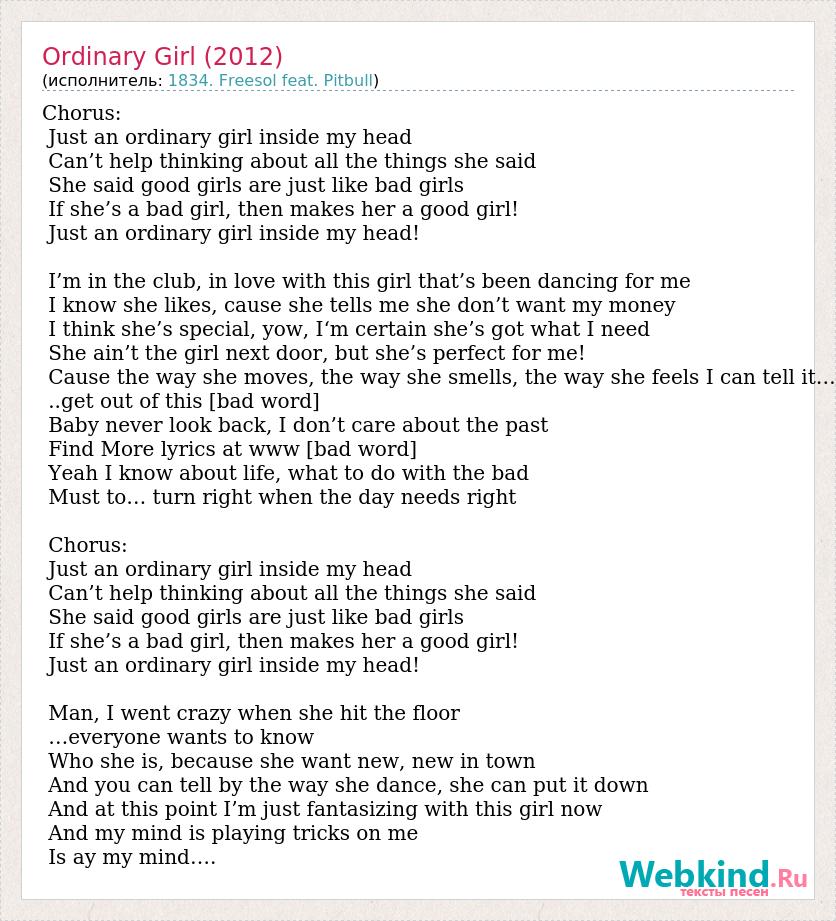 Chorus: Just an ordinary girl inside my head Can’t help thinking about all the things she said She said good girls are just like bad girls If she’s a bad girl, then makes her a good girl! Just an ordinary girl inside my head! I’m in the club, in love with this girl that’s been dancing for me I know she likes, cause she tells me she don’t want my money I think she’s special, yow, I‘m certain she’s got what I need She ain’t the girl next door, but she’s perfect for me! Cause the way she moves, the way she smells, the way she feels I can tell it… ..get out of this [bad word] Baby never look back, I don’t care about the past Find More lyrics at www [bad word] Yeah I know about life, what to do with the bad Must to… turn right when the day needs right Chorus: Just an ordinary girl inside my head Can’t help thinking about all the things she said She said good girls are just like bad girls If she’s a bad girl, then makes her a good girl! Just an ordinary girl inside my head! Man, I went crazy when she hit the floor …everyone wants to know Who she is, because she want new, new in town And you can tell by the way she dance, she can put it down And at this point I’m just fantasizing with this girl now And my mind is playing tricks on me Is ay my mind….