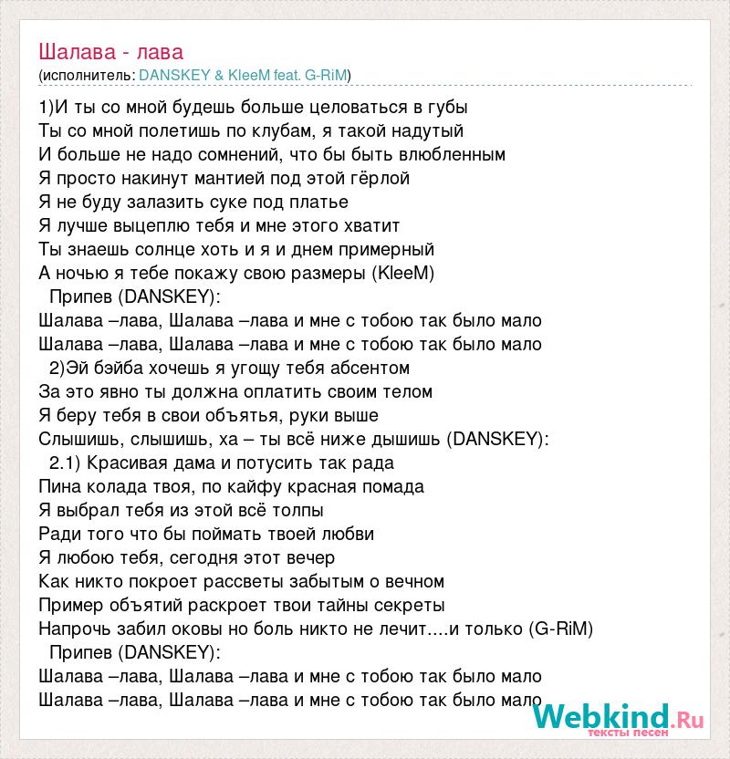 1)И ты со мной будешь больше целоваться в губы Ты со мной полетишь по клубам, я такой надутый И больше не надо сомнений, что бы быть влюбленным Я просто накинут мантией под этой гёрлой Я не буду залазить суке под платье Я лучше выцеплю тебя и мне этого хватит Ты знаешь солнце хоть и я и днем примерный А ночью я тебе покажу свою размеры (KleeM) Припев (DANSKEY): Шалава –лава, Шалава –лава и мне с тобою так было мало Шалава –лава, Шалава –лава и мне с тобою так было мало 2)Эй бэйба хочешь я угощу тебя абсентом За это явно ты должна оплатить своим телом Я беру тебя в свои объятья, руки выше Слышишь, слышишь, ха – ты всё ниже дышишь (DANSKEY): 2.1) Красивая дама и потусить так рада Пина колада твоя, по кайфу красная помада Я выбрал тебя из этой всё толпы Ради того что бы поймать твоей любви Я любою тебя, сегодня этот вечер Как никто покроет рассветы забытым о вечном Пример объятий раскроет твои тайны секреты Напрочь забил оковы но боль никто не лечит....и только (G-RiM) Припев (DANSKEY): Шалава –лава, Шалава –лава и мне с тобою так было мало Шалава –лава, Шалава –лава и мне с тобою так было мало
