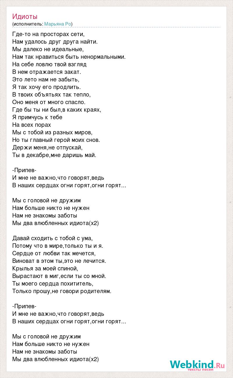 Где-то на просторах сети, Нам удалось друг друга найти. Мы далеко не идеальные, Нам так нравиться быть ненормальными. На себе ловлю твой взгляд В нем отражается закат. Это лето нам не забыть, Я так хочу его продлить. В твоих объятьях так тепло, Оно меня от много спасло. Где бы ты ни был,в каких краях, Я примчусь к тебе На всех порах Мы с тобой из разных миров, Но ты главный герой моих снов. Держи меня,не отпускай, Ты в декабре,мне даришь май. -Припев- И мне не важно,что говорят,ведь В наших сердцах огни горят,огни горят... Мы с головой не дружим Нам больше никто не нужен Нам не знакомы заботы Мы два влюбленных идиота(x2) Давай сходить с тобой с ума, Потому что в мире,только ты и я. Сердце от любви так мечется, Виноват в этом ты,это не лечится. Крылья за моей спиной, Вырастают в миг,если ты со мной. Ты моего сердца похититель, Только прошу,не говори родителям. -Припев- И мне не важно,что говорят,ведь В наших сердцах огни горят,огни горят... Мы с головой не дружим Нам больше никто не нужен Нам не знакомы заботы Мы два влюбленных идиота(x2)