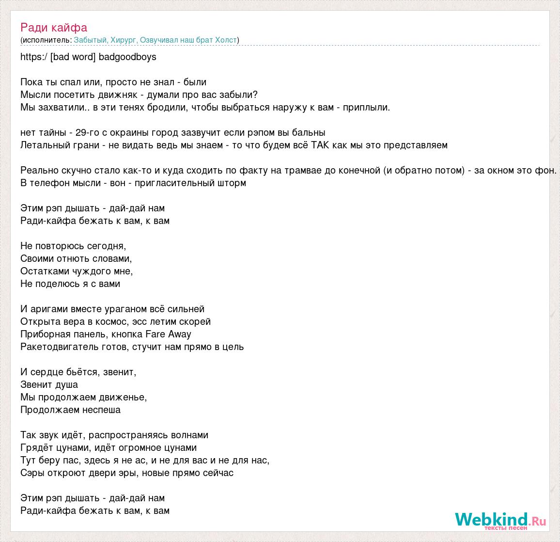 https:/ [bad word] badgoodboys Пока ты спал или, просто не знал - были Мысли посетить движняк - думали про вас забыли? Мы захватили.. в эти тенях бродили, чтобы выбраться наружу к вам - приплыли. нет тайны - 29-го с окраины город зазвучит если рэпом вы бальны Летальный грани - не видать ведь мы знаем - то что будем всё ТАК как мы это представляем Реально скучно стало как-то и куда сходить по факту на трамвае до конечной (и обратно потом) - за окном это фон. В телефон мысли - вон - пригласительный шторм Этим рэп дышать - дай-дай нам Ради-кайфа бежать к вам, к вам Не повторюсь сегодня, Своими отнють словами, Остатками чуждого мне, Не поделюсь я с вами И аригами вместе ураганом всё сильней Открыта вера в космос, эсс летим скорей Приборная панель, кнопка Fare Away Ракетодвигатель готов, стучит нам прямо в цель И сердце бьётся, звенит, Звенит душа Мы продолжаем движенье, Продолжаем неспеша Так звук идёт, распространяясь волнами Грядёт цунами, идёт огромное цунами Тут беру пас, здесь я не ас, и не для вас и не для нас, Сэры откроют двери эры, новые прямо сейчас Этим рэп дышать - дай-дай нам Ради-кайфа бежать к вам, к вам