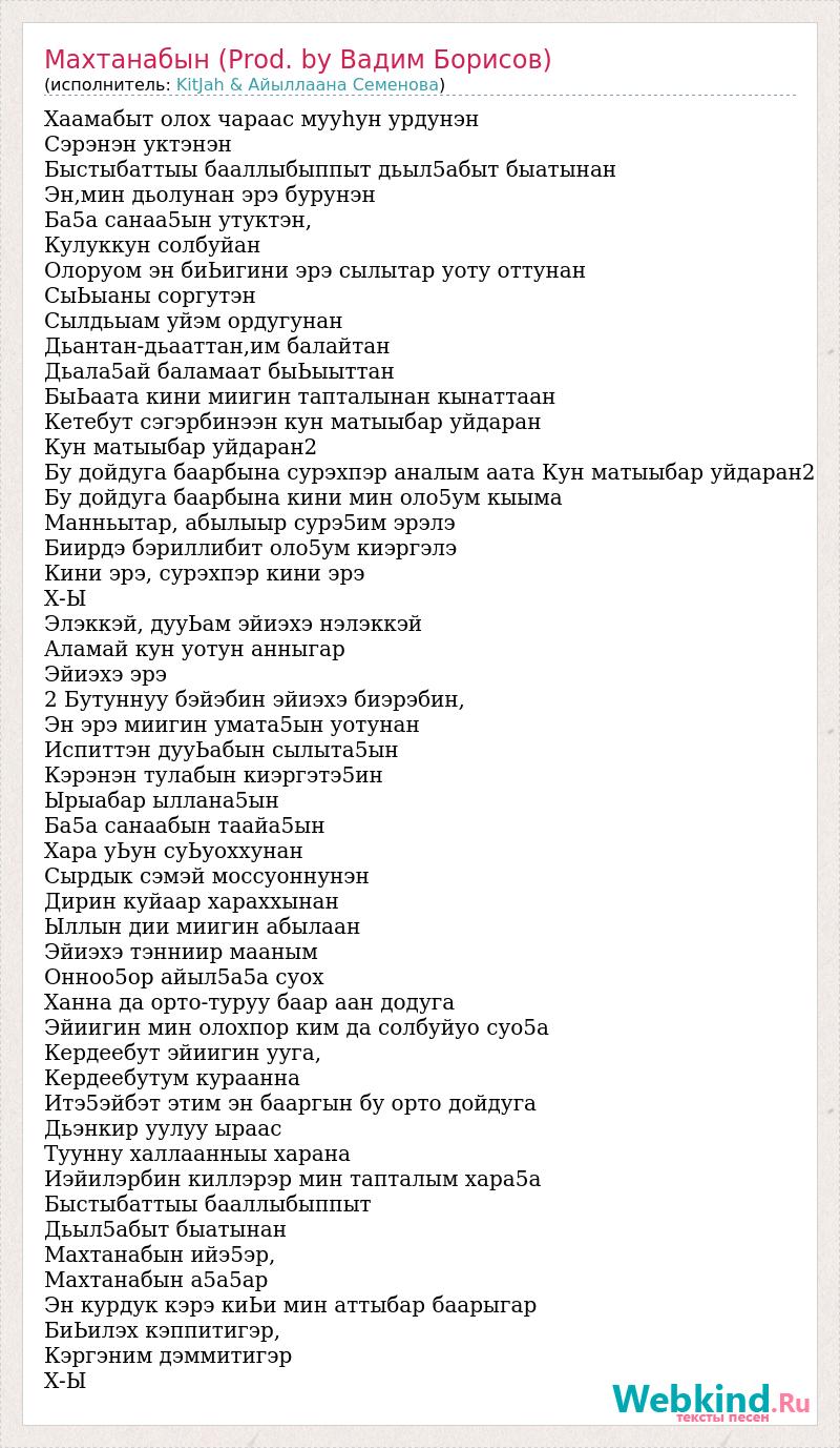 Хаамабыт олох чараас мууhун урдунэн Сэрэнэн уктэнэн Быстыбаттыы бааллыбыппыт дьыл5абыт быатынан Эн,мин дьолунан эрэ бурунэн Ба5а санаа5ын утуктэн, Кулуккун солбуйан Олоруом эн биЬигини эрэ сылытар уоту оттунан СыЬыаны соргутэн Сылдьыам уйэм ордугунан Дьантан-дьааттан,им балайтан Дьала5ай баламаат быЬыыттан БыЬаата кини миигин тапталынан кынаттаан Кетебут сэгэрбинээн кун матыыбар уйдаран Кун матыыбар уйдаран2 Бу дойдуга баарбына сурэхпэр аналым аата Кун матыыбар уйдаран2 Бу дойдуга баарбына кини мин оло5ум кыыма Манньытар, абылыыр сурэ5им эрэлэ Биирдэ бэриллибит оло5ум киэргэлэ Кини эрэ, сурэхпэр кини эрэ Х-Ы Элэккэй, дууЬам эйиэхэ нэлэккэй Аламай кун уотун анныгар Эйиэхэ эрэ 2 Бутуннуу бэйэбин эйиэхэ биэрэбин, Эн эрэ миигин умата5ын уотунан Испиттэн дууЬабын сылыта5ын Кэрэнэн тулабын киэргэтэ5ин Ырыабар ыллана5ын Ба5а санаабын таайа5ын Хара уЬун суЬуоххунан Сырдык сэмэй моссуоннунэн Дирин куйаар хараххынан Ыллын дии миигин абылаан Эйиэхэ тэнниир мааным Онноо5ор айыл5а5а суох Ханна да орто-туруу баар аан додуга Эйиигин мин олохпор ким да солбуйуо суо5а Кердеебут эйиигин ууга, Кердеебутум кураанна Итэ5эйбэт этим эн бааргын бу орто дойдуга Дьэнкир уулуу ыраас Туунну халлаанныы харана Иэйилэрбин киллэрэр мин тапталым хара5а Быстыбаттыы бааллыбыппыт Дьыл5абыт быатынан Махтанабын ийэ5эр, Махтанабын а5а5ар Эн курдук кэрэ киЬи мин аттыбар баарыгар БиЬилэх кэппитигэр, Кэргэним дэммитигэр Х-Ы