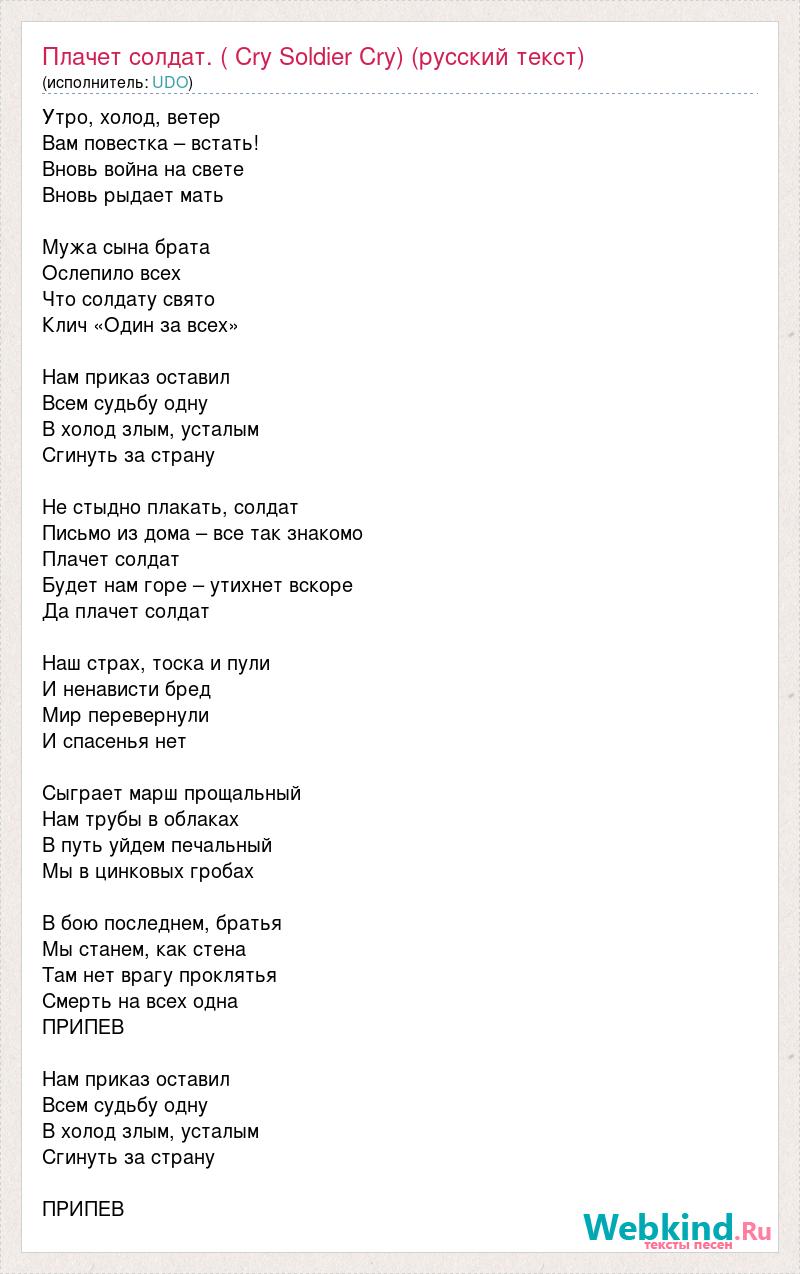 Утро, холод, ветер Вам повестка – встать! Вновь война на свете Вновь рыдает мать Мужа сына брата Ослепило всех Что солдату свято Клич «Один за всех» Нам приказ оставил Всем судьбу одну В холод злым, усталым Сгинуть за страну Не стыдно плакать, солдат Письмо из дома – все так знакомо Плачет солдат Будет нам горе – утихнет вскоре Да плачет солдат Наш страх, тоска и пули И ненависти бред Мир перевернули И спасенья нет Сыграет марш прощальный Нам трубы в облаках В путь уйдем печальный Мы в цинковых гробах В бою последнем, братья Мы станем, как стена Там нет врагу проклятья Смерть на всех одна ПРИПЕВ Нам приказ оставил Всем судьбу одну В холод злым, усталым Сгинуть за страну ПРИПЕВ