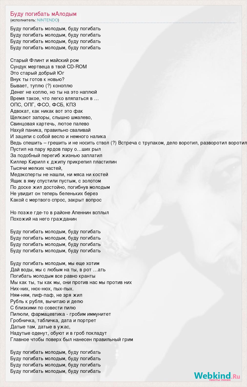 Буду погибать молодым, буду погибать Буду погибать молодым, буду погибать Буду погибать молодым, буду погибать Буду погибать молодым, буду погибать Старый Флинт и майский ром Сундук мертвеца в твой CD-ROM Это старый добрый Юг Внук ты готов к новью? Бывает, туплю (?) коноплю Денег не коплю, но ты на это наплюй Время такое, что легко вляпаться в … ОПС, ОПГ, ФСО, ФСБ, КПЗ Адвокат, как никак вот это фак Щелкают запоры, слышно шмалево, Свинцовая картечь, лютое палево Нахуй паника, правильно сваливай И зацепи с собой весло и немного налика Ведь спешить – грешить и не носить ствол (?) Встреча с трупаком, дело воротил, разворотил воротил Пустил на пару ярдов пару о…ших рыл За подобный перегиб жизнью заплатил Киллер Кирилл к джипу прикрепил пластилин Тысячи мелких частей, Медэксперты не нашли, ни мяса ни костей Ящик в яму спустили пустым, с золотом По доске жил достойно, погибнув молодым Не увидит он теперь беленьких берез Какой с мертвого спрос, закрыт вопрос Но позже где-то в районе Апеннин всплыл Похожий на него гражданин Буду погибать молодым, буду погибать Буду погибать молодым, буду погибать Буду погибать молодым, буду погибать Буду погибать молодым, буду погибать Буду погибать молодым, мы еще хотим Дай воды, мы с любым на ты, в рот …ать Погибать молодым все равно кранты Мы как ты, ты как мы, они против нас мы против них Них-них, нюх-нюх, пых-пых. Ням-ням, пиф-паф, не зря жил Рубль к рубля, вычитаю и делю С близкими по совести пилю Пилюли, фармацевтика - гробим иммунитет Гробничка, табличка, дата и портрет Датые там, датые в ужас, Надутые оденут, обуют и в гроб покладут Главное чтобы поверх был нанесен правильный грим Буду погибать молодым, буду погибать Буду погибать молодым, буду погибать Буду погибать молодым, буду погибать Буду погибать молодым, буду погибать