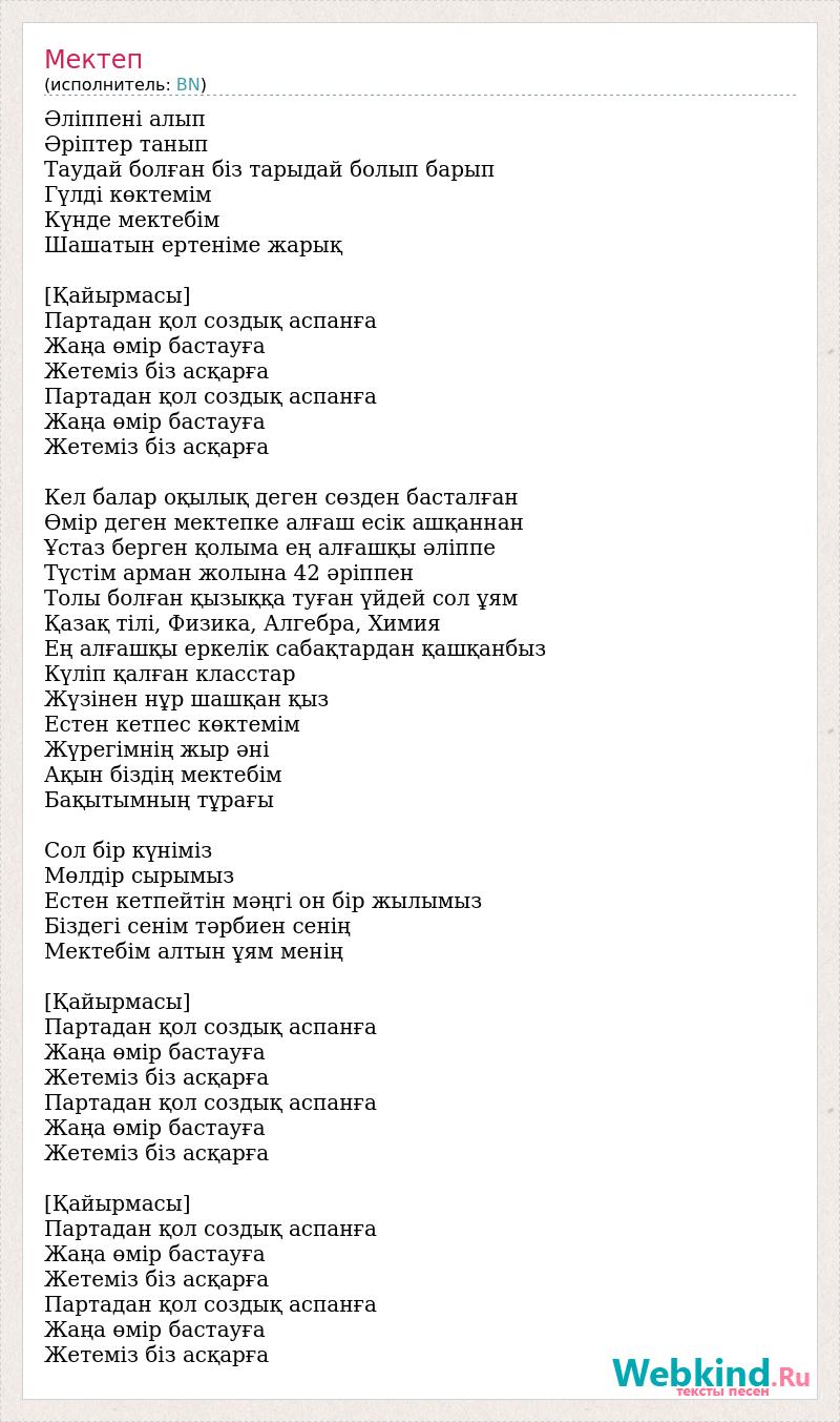Әліппені алып Әріптер танып Таудай болған біз тарыдай болып барып Гүлді көктемім Күнде мектебім Шашатын ертеніме жарық [Қайырмасы] Партадан қол создық аспанға Жаңа өмір бастауға Жетеміз біз асқарға Партадан қол создық аспанға Жаңа өмір бастауға Жетеміз біз асқарға Кел балар оқылық деген сөзден басталған Өмір деген мектепке алғаш есік ашқаннан Ұстаз берген қолыма ең алғашқы әліппе Түстім арман жолына 42 әріппен Толы болған қызыққа туған үйдей сол ұям Қазақ тілі, Физика, Алгебра, Химия Ең алғашқы еркелік сабақтардан қашқанбыз Күліп қалған класстар Жүзінен нұр шашқан қыз Естен кетпес көктемім Жүрегімнің жыр әні Ақын біздің мектебім Бақытымның тұрағы Сол бір күніміз Мөлдір сырымыз Естен кетпейтін мәңгі он бір жылымыз Біздегі сенім тәрбиен сенің Мектебім алтын ұям менің [Қайырмасы] Партадан қол создық аспанға Жаңа өмір бастауға Жетеміз біз асқарға Партадан қол создық аспанға Жаңа өмір бастауға Жетеміз біз асқарға [Қайырмасы] Партадан қол создық аспанға Жаңа өмір бастауға Жетеміз біз асқарға Партадан қол создық аспанға Жаңа өмір бастауға Жетеміз біз асқарға