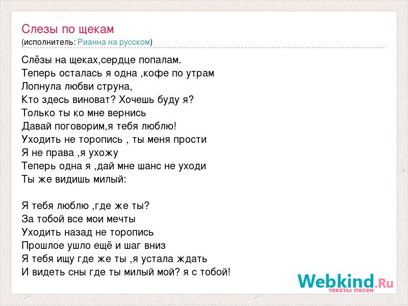Слёзы на щеках,сердце попалам. Теперь осталась я одна ,кофе по утрам Лопнула любви струна, Кто здесь виноват? Хочешь буду я? Только ты ко мне вернись Давай поговорим,я тебя люблю! Уходить не торопись , ты меня прости Я не права ,я ухожу Теперь одна я ,дай мне шанс не уходи Ты же видишь милый: Я тебя люблю ,где же ты? За тобой все мои мечты Уходить назад не торопись Прошлое ушло ещё и шаг вниз Я тебя ищу где же ты ,я устала ждать И видеть сны где ты милый мой? я с тобой!
