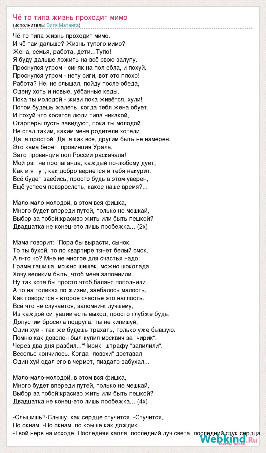 Чё-то типа жизнь проходит мимо. И чё там дальше? Жизнь тупого мимо? Жена, семья, работа, дети...Тупо! Я буду дальше ложить на всё свою залупу. Проснулся утром - синяк на пол ебла, и похуй. Проснулся утром - нету сиги, вот это плохо! Работа? Не, не слышал, пойду после обеда, Одену хоть и новые, уёбанные кеды. Пока ты молодой - живи пока живётся, хули! Потом будешь жалеть, когда тебя жена обует. И похуй что косятся люди типа никакой, Старпёры пусть завидуют, пока ты молодой. Не стал таким, каким меня родители хотели. Да, я простой. Да, я как все, другим быть не намерен. Это кама берег, провинция Урала, Зато провинция пол России раскачала! Мой рэп не пропаганда, каждый по-любому дует, Как и я тут, как добро вернется и тебя накурит. Всё будет заебись, просто будь в этом уверен, Ещё успеем повзрослеть, какое наше время?... Мало-мало-молодой, в этом вся фишка, Много будет впереди путей, только не мешкай, Выбор за тобой:красиво жить или быть пешкой? Двадцатка не конец-это лишь пробежка... (2х) Мама говорит: "Пора бы вырасти, сынок. То ты бухой, то по квартире тянет белый смок." А я-то чо? Мне не многое для счастья надо: Грамм гашиша, можно шишек, можно шоколада. Хочу великим быть, чтоб меня запомнили Ну так хотя бы просто чтоб баланс пополнили. А то на голиках по жизни, заебалось малость, Как говорится - второе счастье это наглость. Всё что не случается, запомни-к лучшему, Из каждой ситуации есть выход, просто глубже будь. Допустим бросила подруга, ты не кипишуй, Один хуй - так же будешь трахать, только уже бывшую. Помню как доволен был-купил москвич за "чирик". Через два дня разбил..."Чирик" штрафу "запилили". Веселье кончилось. Когда "ловэхи" доставал Один хуй сдал его в чермет, пиздато забухал... Мало-мало-молодой, в этом вся фишка, Много будет впереди путей, только не мешкай, Выбор за тобой:красиво жить или быть пешкой? Двадцатка не конец-это лишь пробежка... (4х) -Слышишь?-Слышу, как сердце стучится. -Стучится, По окнам. -По окнам, по крыше как дождик... -Твой нерв на исходе. Последняя капля, последний луч света, последний стук сердца...
