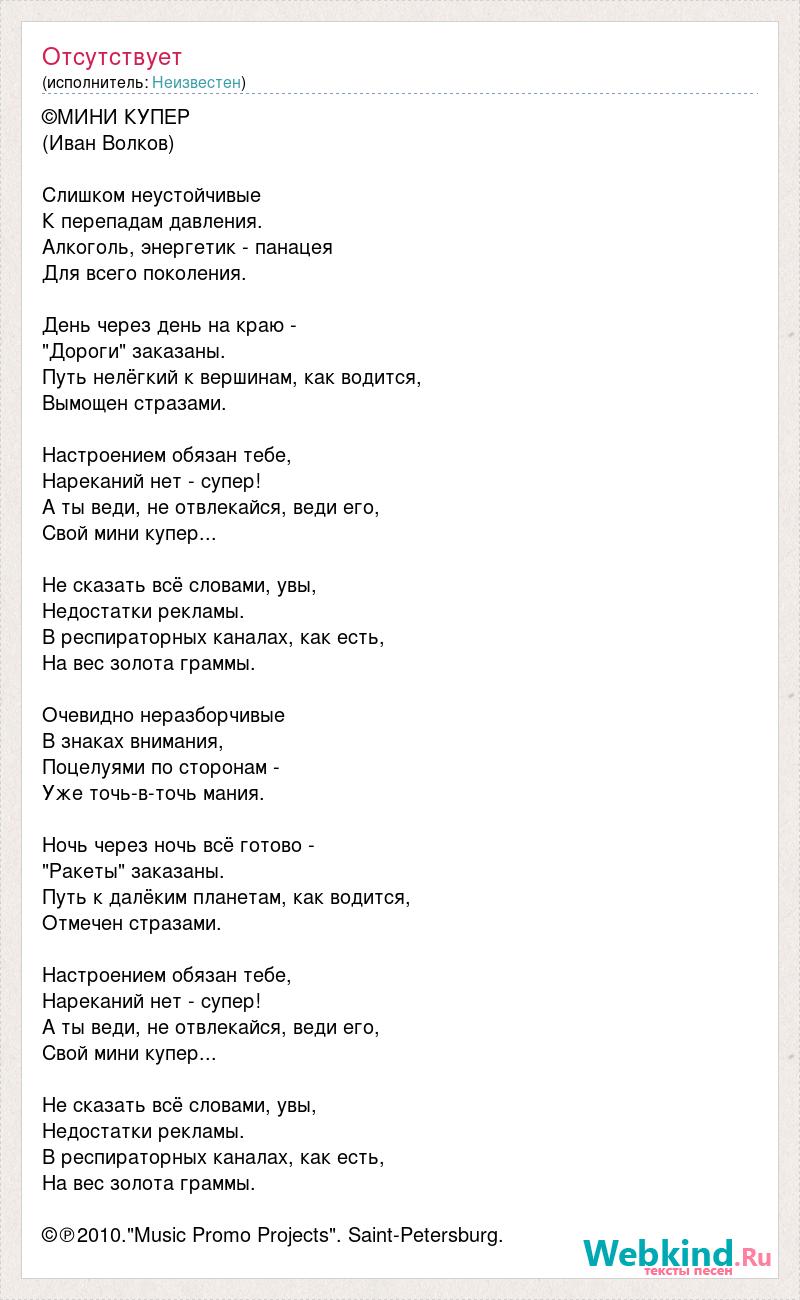 ©МИНИ КУПЕР (Иван Волков) Слишком неустойчивые К перепадам давления. Алкоголь, энергетик - панацея Для всего поколения. День через день на краю - "Дороги" заказаны. Путь нелёгкий к вершинам, как водится, Вымощен стразами. Настроением обязан тебе, Нареканий нет - супер! А ты веди, не отвлекайся, веди его, Свой мини купер... Не сказать всё словами, увы, Недостатки рекламы. В респираторных каналах, как есть, На вес золота граммы. Очевидно неразборчивые В знаках внимания, Поцелуями по сторонам - Уже точь-в-точь мания. Ночь через ночь всё готово - "Ракеты" заказаны. Путь к далёким планетам, как водится, Отмечен стразами. Настроением обязан тебе, Нареканий нет - супер! А ты веди, не отвлекайся, веди его, Свой мини купер... Не сказать всё словами, увы, Недостатки рекламы. В респираторных каналах, как есть, На вес золота граммы. ©℗2010."Music Promo Projects". Saint-Petersburg.