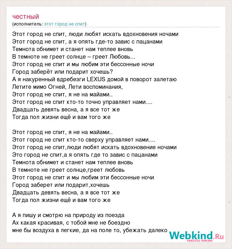Этот город не спит, люди любят искать вдохновения ночами Этот город не спит, а я опять где-то завис с пацанами Темнота обнимет и станет нам теплее вновь В темноте не греет солнце – греет Любовь... Этот город не спит и мы любим эти бессонные ночи Город заберёт или подарит хочешь? А я накуренный вдребезги LEXUS домой в поворот залетаю Летите мимо Огней, Лети воспоминания, Этот город не спит, я не на майами.. Этот город не спит кто-то точно управляет нами.... Двадцать девять весна, а я все тот же Тогда пол жизни ещё и вам того же Этот город не спит, я не на майами.. Этот город не спит кто-то сверху управляет нами.... Этот город не спит,люди любят искать вдохновение ночами Это город не спит,а я опять где то завис с пацанами Темнота обнимет и станет нам теплее вновь В темноте не греет солнце,греет любовь Этот город не спит и мы любим эти бессонные ночи Город заберет или подарит,хочешь Двадцать девять весна, а я все тот же Тогда пол жизни ещё и вам того же А я пишу и смотрю на природу из поезда Ах какая красивая, с тобой мне не боездно мне бы воздуха в легкие, да на поле то, убежать далеко