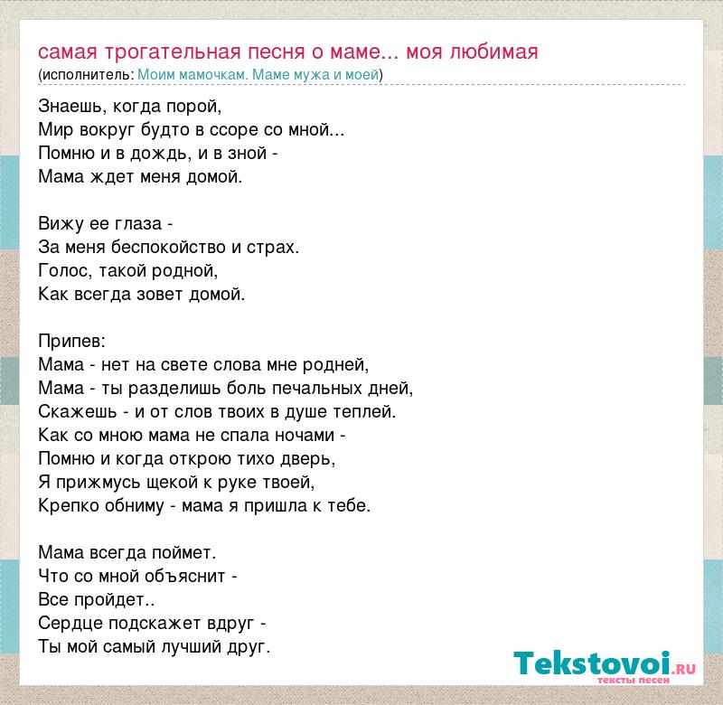 Знаешь, когда порой, Мир вокруг будто в ссоре со мной... Помню и в дождь, и в зной - Мама ждет меня домой. Вижу ее глаза - За меня беспокойство и страх. Голос, такой родной, Как всегда зовет домой. Припев: Мама - нет на свете слова мне родней, Мама - ты разделишь боль печальных дней, Скажешь - и от слов твоих в душе теплей. Как со мною мама не спала ночами - Помню и когда открою тихо дверь, Я прижмусь щекой к руке твоей, Крепко обниму - мама я пришла к тебе. Мама всегда поймет. Что со мной объяснит - Все пройдет.. Сердце подскажет вдруг - Ты мой самый лучший друг.