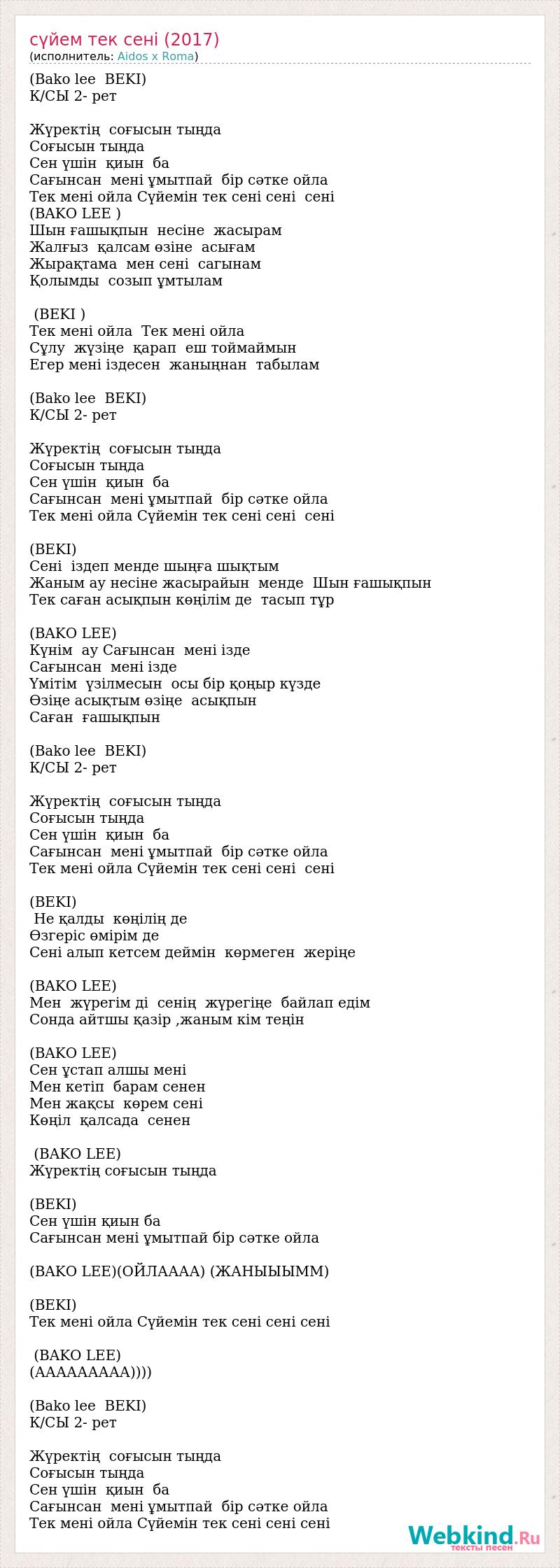 (Bako lee BEKI) К/СЫ 2- рет Жүректің соғысын тыңда Соғысын тыңда Сен үшін қиын ба Сағынсан мені ұмытпай бір сәтке ойла Тек мені ойла Сүйемін тек сені сені сені (BAKO LEE ) Шын ғашықпын несіне жасырам Жалғыз қалсам өзіне асығам Жырақтама мен сені сагынам Қолымды созып ұмтылам (BEKI ) Тек мені ойла Тек мені ойла Сұлу жүзіңе қарап еш тоймаймын Егер мені іздесен жаныңнан табылам (Bako lee BEKI) К/СЫ 2- рет Жүректің соғысын тыңда Соғысын тыңда Сен үшін қиын ба Сағынсан мені ұмытпай бір сәтке ойла Тек мені ойла Сүйемін тек сені сені сені (BEKI) Сені іздеп менде шыңға шықтым Жаным ау несіне жасырайын менде Шын ғашықпын Тек саған асықпын көңілім де тасып тұр (BAKO LEE) Күнім ау Сағынсан мені ізде Сағынсан мені ізде Үмітім үзілмесын осы бір қоңыр күзде Өзіңе асықтым өзіңе асықпын Саған ғашықпын (Bako lee BEKI) К/СЫ 2- рет Жүректің соғысын тыңда Соғысын тыңда Сен үшін қиын ба Сағынсан мені ұмытпай бір сәтке ойла Тек мені ойла Сүйемін тек сені сені сені (BEKI) Не қалды көңілің де Өзгеріс өмірім де Сені алып кетсем деймін көрмеген жеріңе (BAKO LEE) Мен жүрегім ді сенің жүрегіңе байлап едім Сонда айтшы қазір ,жаным кім теңін (BAKO LEE) Сен ұстап алшы мені Мен кетіп барам сенен Мен жақсы көрем сені Көңіл қалсада сенен (BAKO LEE) Жүректің соғысын тыңда (BEKI) Сен үшін қиын ба Сағынсан мені ұмытпай бір сәтке ойла (BAKO LEE)(ОЙЛАААА) (ЖАНЫЫЫММ) (BEKI) Тек мені ойла Сүйемін тек сені сені сені (BAKO LEE) (ААААААААА)))) (Bako lee BEKI) К/СЫ 2- рет Жүректің соғысын тыңда Соғысын тыңда Сен үшін қиын ба Сағынсан мені ұмытпай бір сәтке ойла Тек мені ойла Сүйемін тек сені сені сені