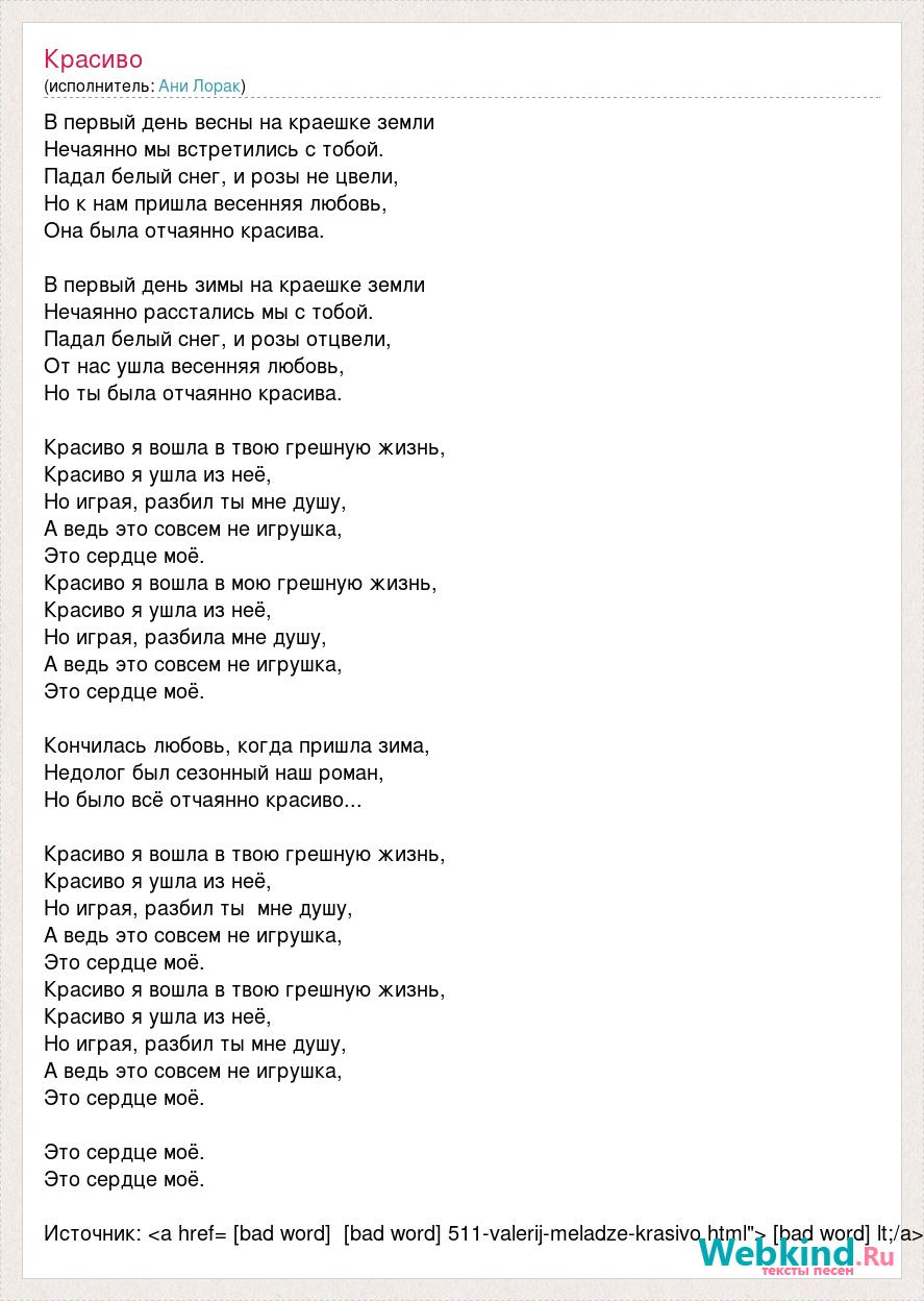 В первый день весны на краешке земли Нечаянно мы встретились с тобой. Падал белый снег, и розы не цвели, Но к нам пришла весенняя любовь, Она была отчаянно красива. В первый день зимы на краешке земли Нечаянно расстались мы с тобой. Падал белый снег, и розы отцвели, От нас ушла весенняя любовь, Но ты была отчаянно красива. Красиво я вошла в твою грешную жизнь, Красиво я ушла из неё, Но играя, разбил ты мне душу, А ведь это совсем не игрушка, Это сердце моё. Красиво я вошла в мою грешную жизнь, Красиво я ушла из неё, Но играя, разбила мне душу, А ведь это совсем не игрушка, Это сердце моё. Кончилась любовь, когда пришла зима, Недолог был сезонный наш роман, Но было всё отчаянно красиво... Красиво я вошла в твою грешную жизнь, Красиво я ушла из неё, Но играя, разбил ты мне душу, А ведь это совсем не игрушка, Это сердце моё. Красиво я вошла в твою грешную жизнь, Красиво я ушла из неё, Но играя, разбил ты мне душу, А ведь это совсем не игрушка, Это сердце моё. Это сердце моё. Это сердце моё. Источник: <a href= [bad word] [bad word] 511-valerij-meladze-krasivo.html"> [bad word] lt;/a>