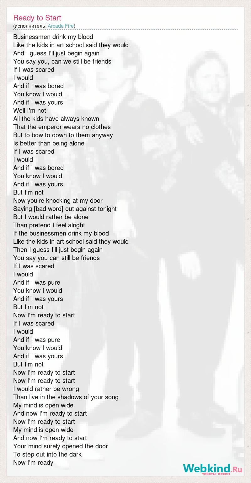 Businessmen drink my blood Like the kids in art school said they would And I guess I'll just begin again You say you, can we still be friends If I was scared I would And if I was bored You know I would And if I was yours Well I'm not All the kids have always known That the emperor wears no clothes But to bow to down to them anyway Is better than being alone If I was scared I would And if I was bored You know I would And if I was yours But I'm not Now you're knocking at my door Saying [bad word] out against tonight But I would rather be alone Than pretend I feel alright If the businessmen drink my blood Like the kids in art school said they would Then I guess I'll just begin again You say you can still be friends If I was scared I would And if I was pure You know I would And if I was yours But I'm not Now I'm ready to start If I was scared I would And if I was pure You know I would And if I was yours But I'm not Now I'm ready to start Now I'm ready to start I would rather be wrong Than live in the shadows of your song My mind is open wide And now I'm ready to start Now I'm ready to start My mind is open wide And now I'm ready to start Your mind surely opened the door To step out into the dark Now I'm ready