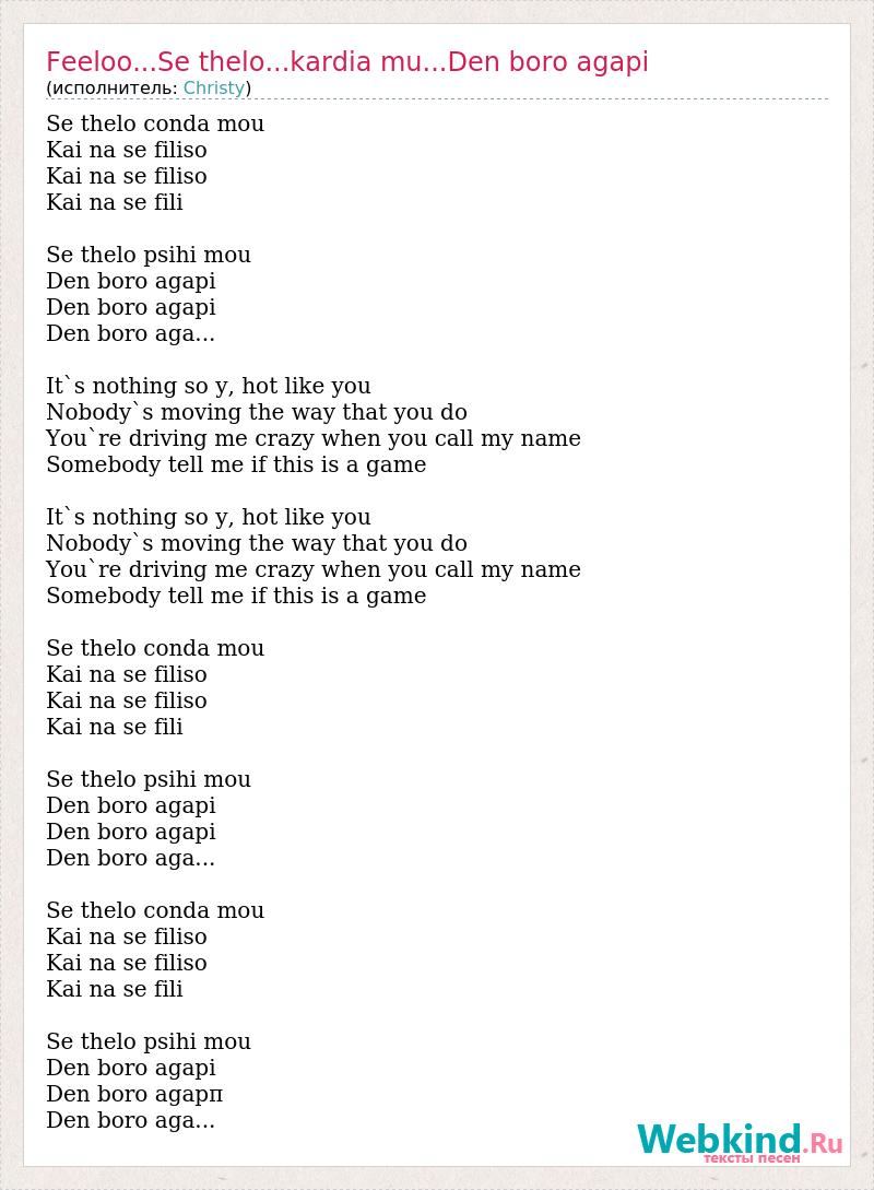 Se thelo conda mou Kai na se filiso Kai na se filiso Kai na se fili Se thelo psihi mou Den boro agapi Den boro agapi Den boro aga... It`s nothing so y, hot like you Nobody`s moving the way that you do You`re driving me crazy when you call my name Somebody tell me if this is a game It`s nothing so y, hot like you Nobody`s moving the way that you do You`re driving me crazy when you call my name Somebody tell me if this is a game Se thelo conda mou Kai na se filiso Kai na se filiso Kai na se fili Se thelo psihi mou Den boro agapi Den boro agapi Den boro aga... Se thelo conda mou Kai na se filiso Kai na se filiso Kai na se fili Se thelo psihi mou Den boro agapi Den boro agapп Den boro aga...