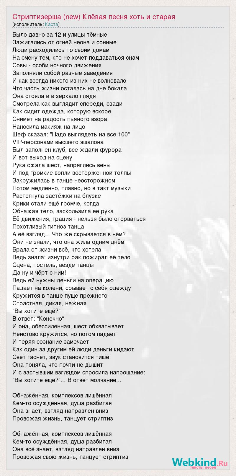 Было давно за 12 и улицы тёмные Зажигались от огней неона и сонные Люди расходились по своим домам На смену тем, кто не хочет поддаваться снам Совы - особи ночного движения Заполняли собой разные заведения И как всегда никого из них не волновало Что часть жизни осталась на дне бокала Она стояла и в зеркало глядя Смотрела как выглядит спереди, сзади Как сидит одежда, которую вскоре Снимет на радость пьяного взора Наносила макияж на лицо Шеф сказал: "Надо выглядеть на все 100" VIP-персонами высшего эшалона Был заполнен клуб, все ждали фурора И вот выход на сцену Рука сжала шест, напряглись вены И под громкие вопли восторженной толпы Закружилась в танце неосторожном Потом медленно, плавно, но в такт музыки Растегнула застёжки на блузке Крики стали ещё громче, когда Обнажая тело, заскользила её рука Её движения, грация - нельзя было оторваться Похотливый гипноз танца А её взгляд... Что же скрывается в нём? Они не знали, что она жила одним днём Брала от жизни всё, что хотела Ведь знала: изнутри рак пожирал её тело Сцена, постель, везде танцы Да ну и чёрт с ним! Ведь ей нужны деньги на операцию Падает на колени, срывает с себя одежду Кружится в танце пуще прежнего Страстная, дикая, нежная "Вы хотите ещё?" В ответ: "Конечно" И она, обессиленная, шест обхватывает Неистово кружится, но потом падает И теряя сознание замечает Как один за другим ей люди деньги кидают Свет гаснет, звук становится тише Она поняла, что почти не дышит И с застывшим взглядом спросила напрощание: "Вы хотите ещё?"... В ответ молчание... Обнажённая, комплексов лишённая Кем-то осуждённая, душа разбитая Она знает, взгляд направлен вниз Провожая жизнь, танцует стриптиз Обнажённая, комплексов лишённая Кем-то осуждённая, душа разбитая Она всё знает, взгляд направлен вниз Провожая свою жизнь, танцует стриптиз