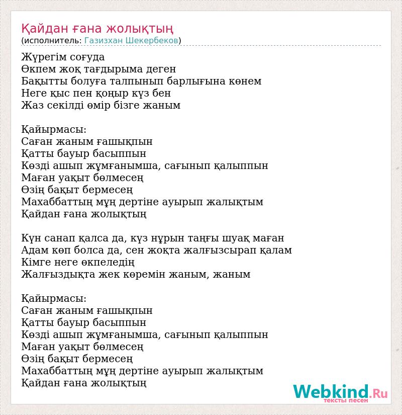 Жүрегім соғуда Өкпем жоқ тағдырыма деген Бақытты болуға талпынып барлығына көнем Неге қыс пен қоңыр күз бен Жаз секілді өмір бізге жаным Қайырмасы: Саған жаным ғашықпын Қатты бауыр басыппын Көзді ашып жұмғанымша, сағынып қалыппын Маған уақыт бөлмесең Өзің бақыт бермесең Махаббаттың мұң дертіне ауырып жалықтым Қайдан ғана жолықтың Күн санап қалса да, күз нұрын таңғы шуақ маған Адам көп болса да, сен жоқта жалғызсырап қалам Кімге неге өкпеледің Жалғыздықта жек көремін жаным, жаным Қайырмасы: Саған жаным ғашықпын Қатты бауыр басыппын Көзді ашып жұмғанымша, сағынып қалыппын Маған уақыт бөлмесең Өзің бақыт бермесең Махаббаттың мұң дертіне ауырып жалықтым Қайдан ғана жолықтың