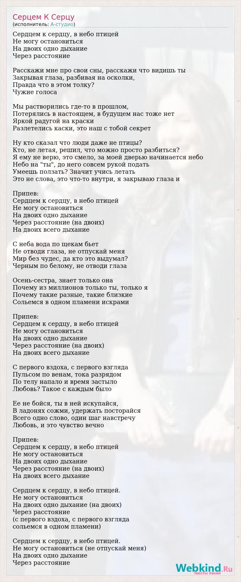 Сердцем к сердцу, в небо птицей Не могу остановиться На двоих одно дыхание Через расстояние Расскажи мне про свои сны, расскажи что видишь ты Закрывая глаза, разбивая на осколки, Правда что в этом толку? Чужие голоса Мы растворились где-то в прошлом, Потерялись в настоящем, в будущем нас тоже нет Яркой радугой на краски Разлетелись каски, это наш с тобой секрет Ну кто сказал что люди даже не птицы? Кто, не летая, решил, что можно просто разбиться? Я ему не верю, это смело, за моей дверью начинается небо Небо на "ты", до него совсем рукой подать Умеешь ползать? Значит учись летать Это не слова, это что-то внутри, я закрываю глаза и Припев: Сердцем к сердцу, в небо птицей Не могу остановиться На двоих одно дыхание Через расстояние (на двоих) На двоих всего дыхание С неба вода по щекам бьет Не отводи глаза, не отпускай меня Мир без чудес, да кто это выдумал? Черным по белому, не отводи глаза Осень-сестра, знает только она Почему из миллионов только ты, только я Почему такие разные, такие близкие Сольемся в одном пламени искрами Припев: Сердцем к сердцу, в небо птицей Не могу остановиться На двоих одно дыхание Через расстояние (на двоих) На двоих всего дыхание С первого вздоха, с первого взгляда Пульсом по венам, тока разрядом По телу напало и время застыло Любовь? Такое с каждым было Ее не бойся, ты в ней искупайся, В ладонях сожми, удержать посторайся Всего одно слово, один шаг навстречу Любовь, и это чувство вечно Припев: Сердцем к сердцу, в небо птицей Не могу остановиться На двоих одно дыхание Через расстояние (на двоих) На двоих всего дыхание Сердцем к сердцу, в небо птицей. Не могу остановиться На двоих одно дыхание (на двоих) Через расстояние (с первого вздоха, с первого взгляда сольемся в одном пламени) Сердцем к сердцу, в небо птицей. Не могу остановиться (не отпускай меня) На двоих одно дыхание Через расстояние