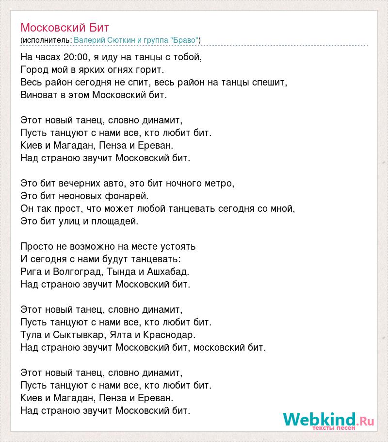 На часах 20:00, я иду на танцы с тобой, Город мой в ярких огнях горит. Весь район сегодня не спит, весь район на танцы спешит, Виноват в этом Московский бит. Этот новый танец, словно динамит, Пусть танцуют с нами все, кто любит бит. Киев и Магадан, Пенза и Ереван. Над страною звучит Московский бит. Это бит вечерних авто, это бит ночного метро, Это бит неоновых фонарей. Он так прост, что может любой танцевать сегодня со мной, Это бит улиц и площадей. Просто не возможно на месте устоять И сегодня с нами будут танцевать: Рига и Волгоград, Тында и Ашхабад. Над страною звучит Московский бит. Этот новый танец, словно динамит, Пусть танцуют с нами все, кто любит бит. Тула и Сыктывкар, Ялта и Краснодар. Над страною звучит Московский бит, московский бит. Этот новый танец, словно динамит, Пусть танцуют с нами все, кто любит бит. Киев и Магадан, Пенза и Ереван. Над страною звучит Московский бит.